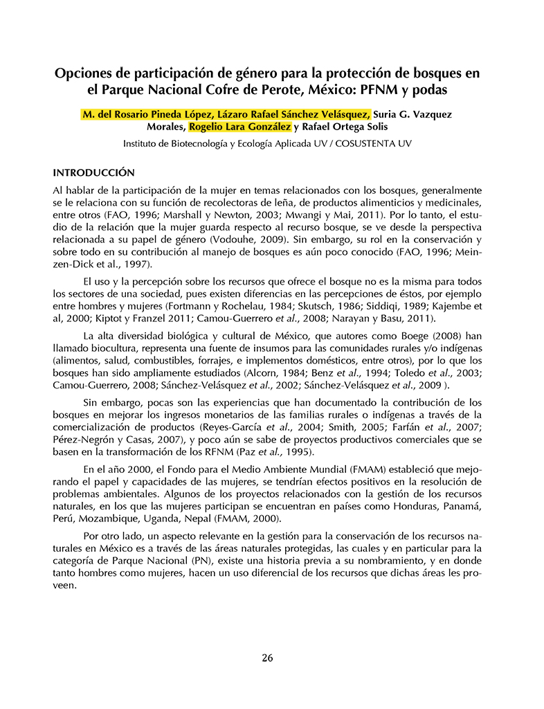 M. del Rosario Pineda López, Lázaro Rafael Sánchez Velásquez, Suria G. Vazquez Morales, Rogelio Lara González y Rafael Ortega Solis (2016). Opciones de participación de género para la protección de bosques en el Parque Nacional Cofre de Perote, México: PFNM y podas Pp. 26-33. ISBN 978-607-8445-14-1 |