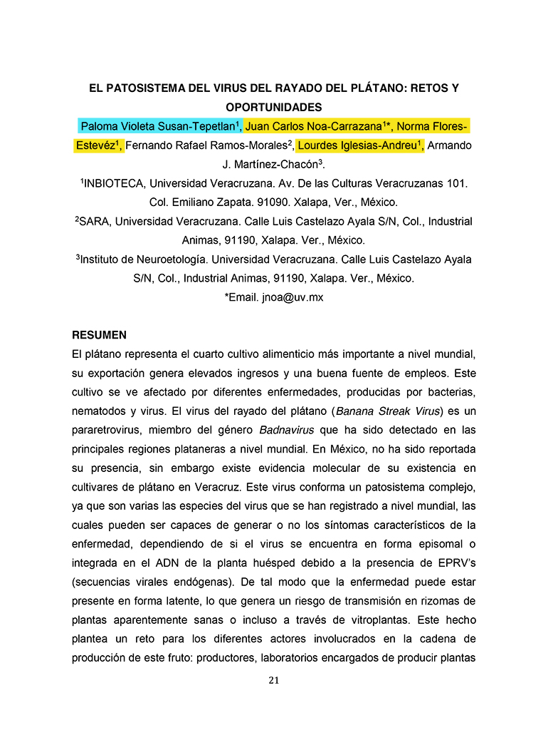 Susan-Tepetlan, P.V., Noa-Carrazana, J.C., Flores-Estévez, N., Iglesias-Andreu, L., Ramos-Moralez, F.R., y Martinez-Chacon, A.J. (2016). El Patosistema del Virus del Rayado Del Plátano: Retos y Oportunidades Pp. 21-36. |