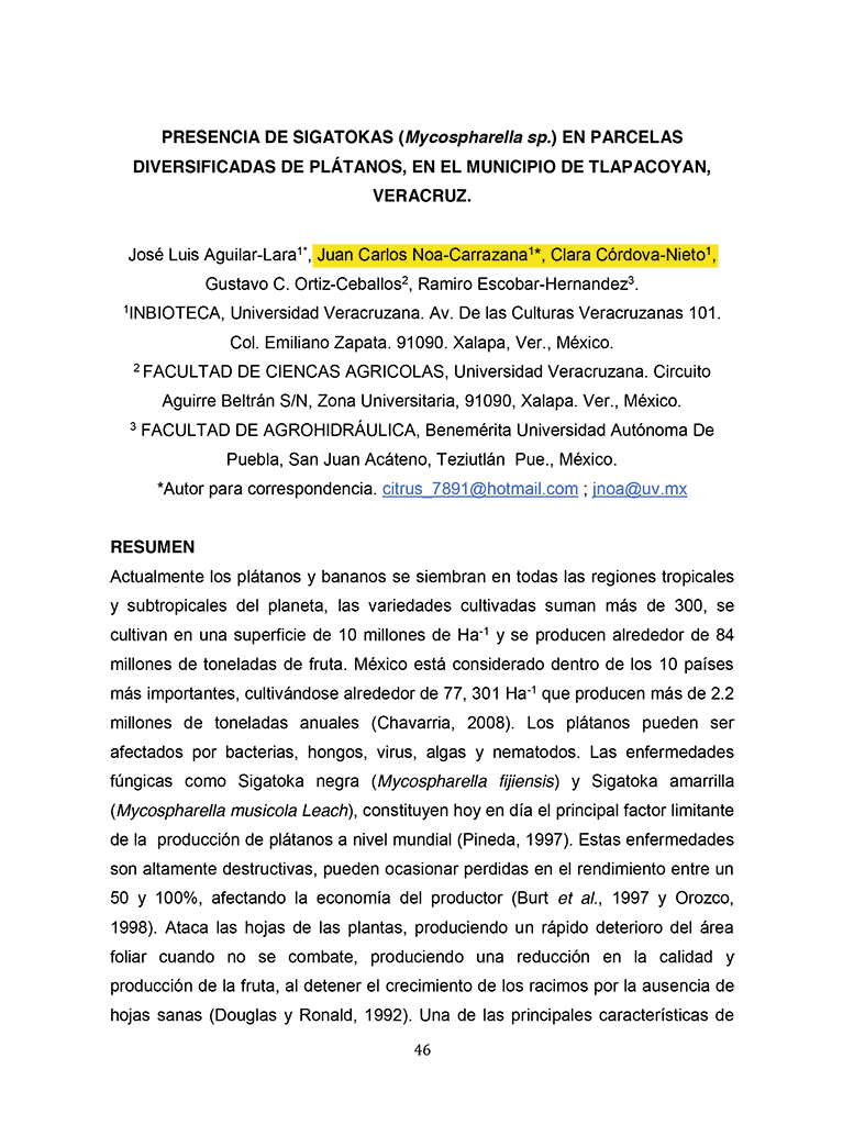 Aguilar-Lara, J.L., Noa-Carrazana, J.C., Córdova-Nieto, C., Ortiz-Ceballos, G., y Escobar-Hernandez, R. (2016). Presencia de sigatokas (Mycospharella sp.) en parcelas diversificadas de plátanos, en el municipio de Tlapacoyan, Veracruz. Pp. 46-61. |