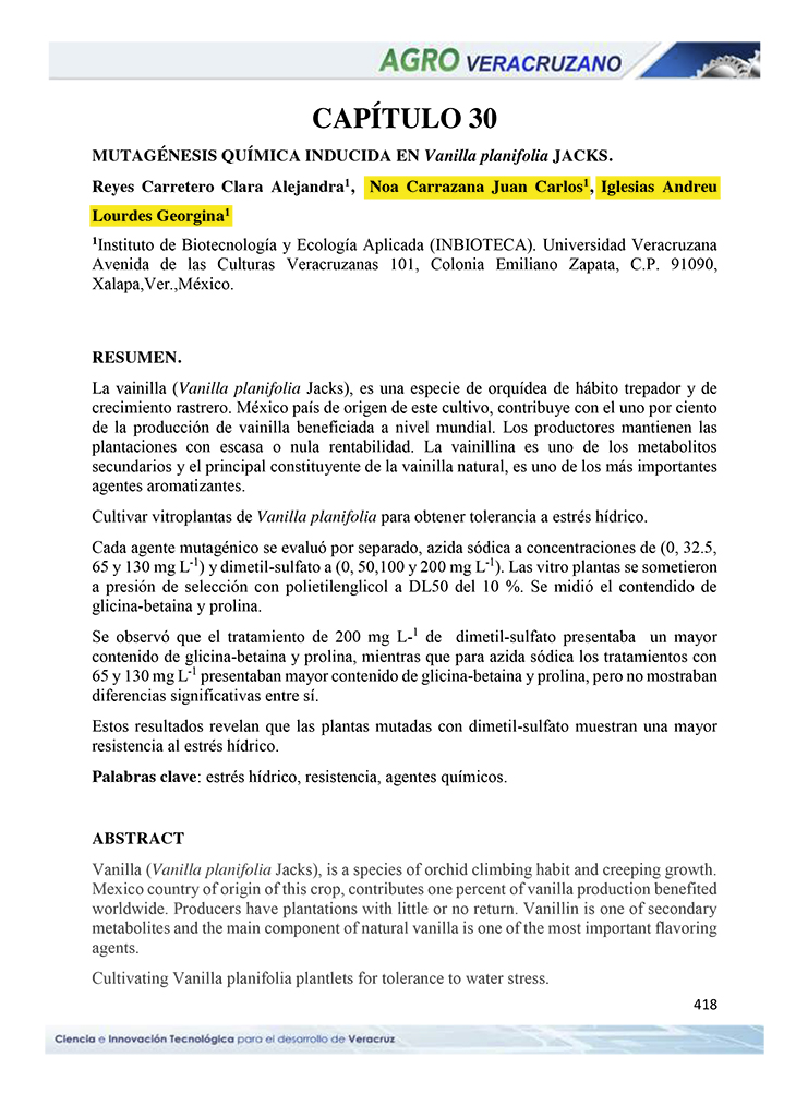 Reyes Carretero, C.A., Noa-Carrazana, J.C., Iglesias-Andreu, L.G. (2016). Mutagénesis química inducida en Vanilla planifolia Jacks. Pp. 418-427. ISBN: 978-607-97384-0-2. |