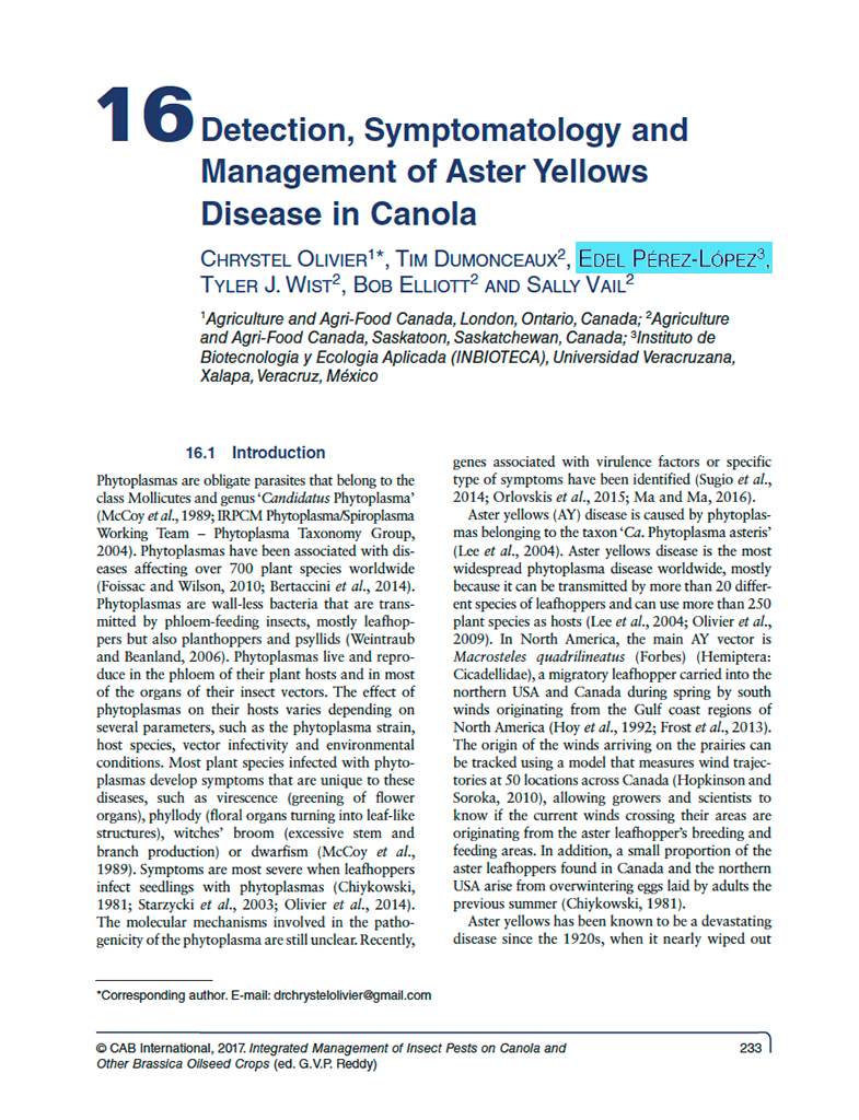 Chrystel Olivier, Tim Dumonceaux, Edel Pérez-López, Tyler J. Wist, Bob Elliot and Sally Vail (2017). Detection, Symptomatology and Management of Aster Yellows Disease in Canola Pp. 233-246. ISBN-13: 978-1-78064-820-0 |