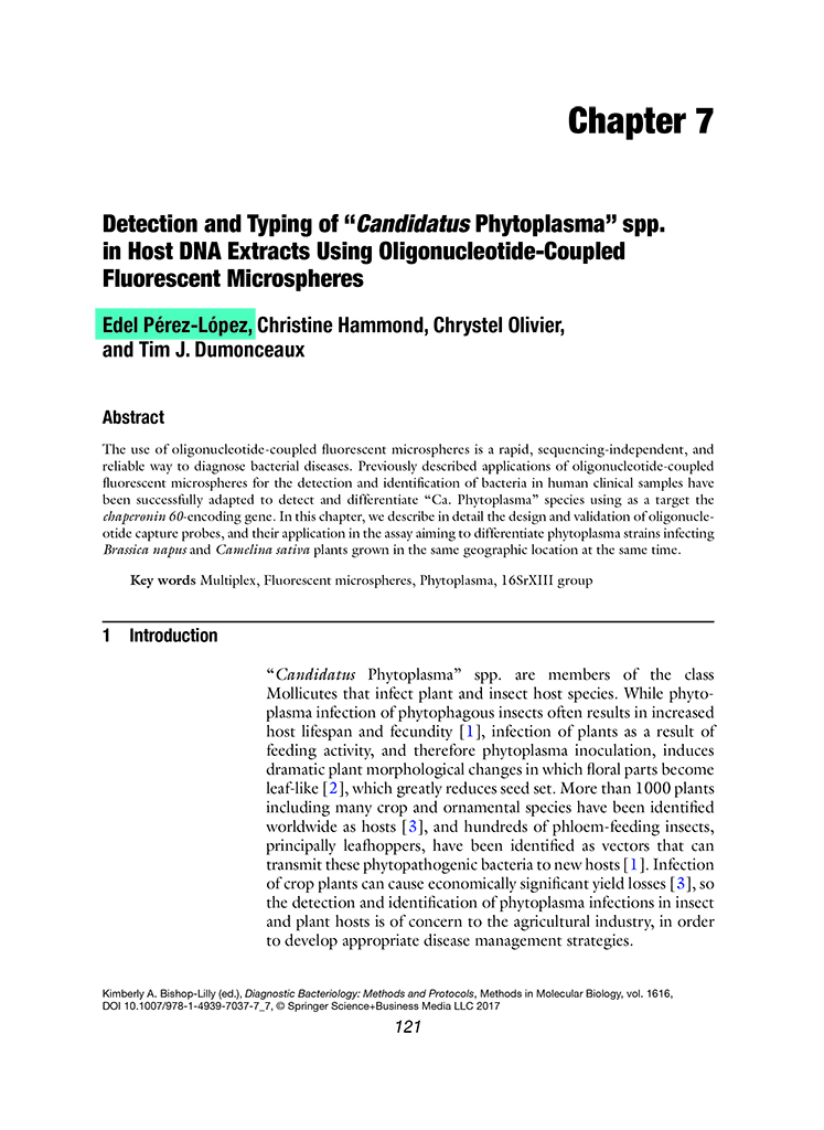 Edel Pérez-López, Christine Hammond, Chrystel Olivier, and Tim J. Dumonceaux (2017). Detection and Typing of "Candidatus Phytoplasma" spp. in Host DNA Extracts Using Oligonucleotide-Coupled Fluorescent Microspheres Pp. 121-136. ISBN: 978-1-4939-7035-3 ISBN: 978-1-4939-7037-7 (eBook) DOI 10.1007/978-1-4939-7037-7 |