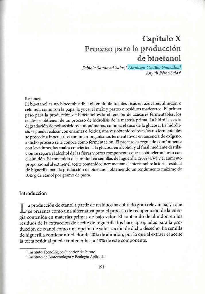 Fabiola Sandoval Salas, Abraham Castillo González, Anyuli Pérez Salas (2016). Capítulo X: Proceso para la producción de bioetanol Pp. 191-206. ISBN: 978-607-437-378-3. |