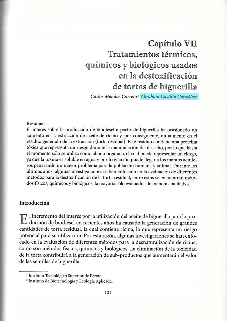 Carlos Méndez Carretero, Abraham Castillo González (2016). Capítulo VII: Tratamientos térmicos, químicos y biológicos usados en la destoxificación de tortas de higuerilla Pp. 121-126. ISBN: 978-607-437-378-3. |