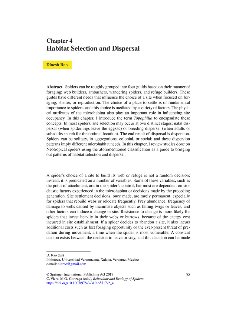 Dinesh Rao (2017). Habitat Selection and Dispersal Pp. 85-108. Print ISBN: 978-3-319-65716-5 Online ISBN: 978-3-319-65717-2 DOI: 10.1007/978-3-319-65717-2_4 |