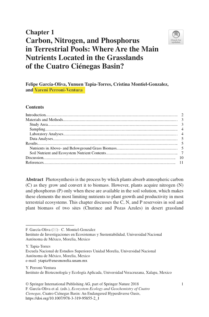 García-Oliva, F., Tapia-Torres, Y., Montiel-Gonzalez, C., Perroni-Ventura, Y. (2018). Carbon, Nitrogen, and Phosphorus in Terrestrial Pools: Where are the main nutrients located in the grasslands of the Cuatro Ciénegas Basin? Pp. 1-13. Print ISBN: 978-3-319-95855-2 |