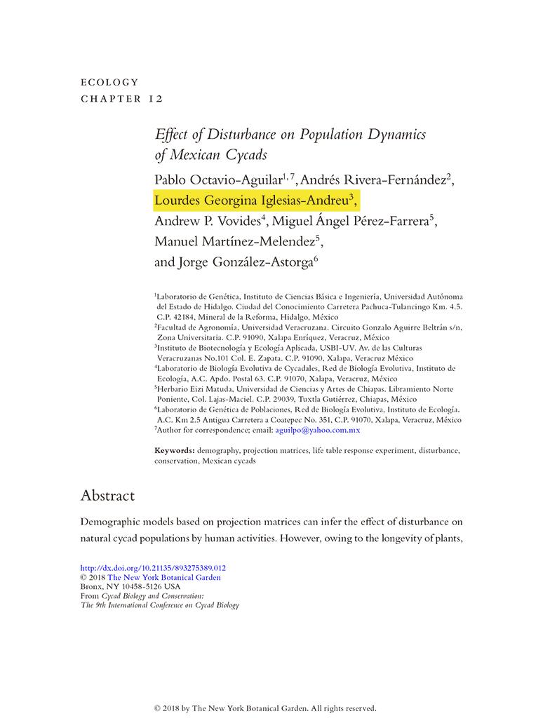 Pablo Octavio-Aguilar, Andrés Rivera-Fernández, Lourdes Georgina Iglesias-Andreu, Andrew P. Vovides, Miguel Ángel Pérez-Farrera, Manuel Martínez-Melendez and Jorge González-Astorga (2018). Effect of Disturbance on Population Dynamics of Mexican Cycads Pp. 146-156. |