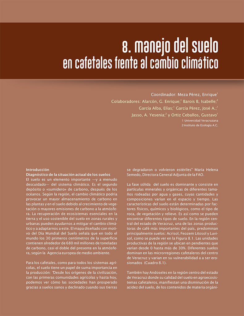 Meza Pérez, Enrique; Alarcón G. Enrique; Barois B, Isabelle; García Alba, Elías; García Pérez, José A.; Jasso, A. Yesenia y Ortiz Ceballos, Gustavo (2018). Manejo del suelo en cafetales frente al cambio climático Primera edición 2018, Pages 131-143. ISBN: 978-607-7579-81-6 |