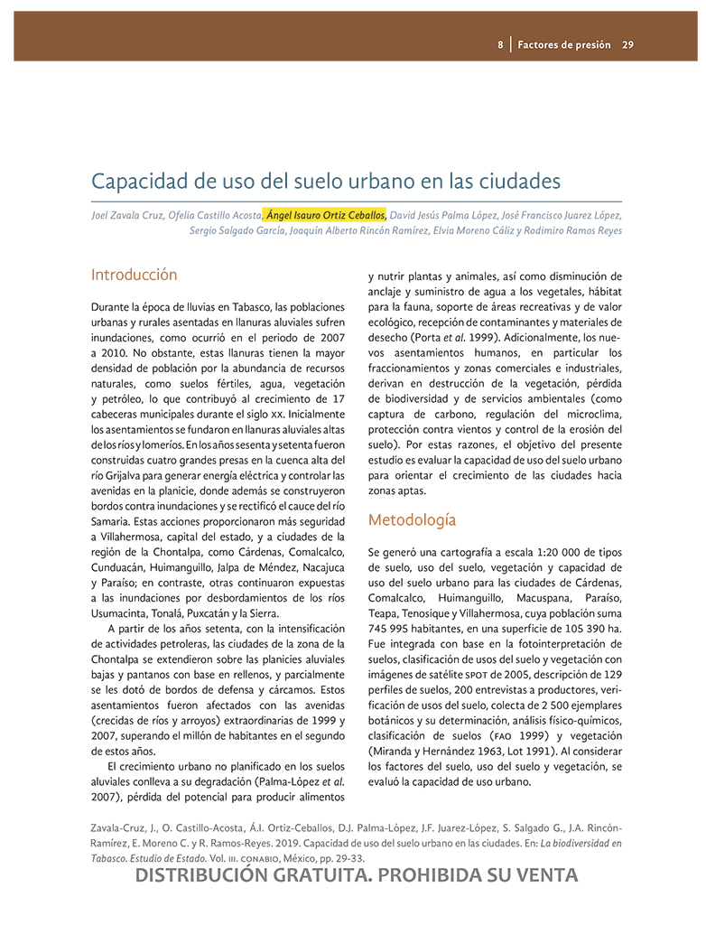 Zavala-Cruz, J., O. Castillo-Acosta, Á.I. Ortiz-Ceballos, D.J. Palma-López, J.F. Juarez-López, S. Salgado G., J.A. Rincón- Ramírez, E. Moreno C. y R. Ramos-Reyes (2019). Capacidad de uso del suelo urbano en las ciudades Vol. III, pp. 29-33. ISBN: 9786078570195 |