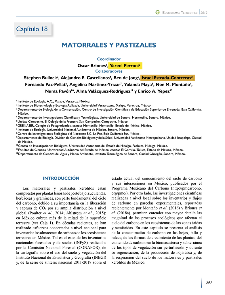 Briones O., Perroni Y., Bullock S, Castellanos A.E., de Jong B., Estrada-Contreras I., Paz-Pellat F., Martínez-Yrízar A., Maya Y., Montaño N.M., Pavón N., Velázquez-Rodríguez A., Yepez EA (2019). Matorrales y Pastizales pp. 353-385. |