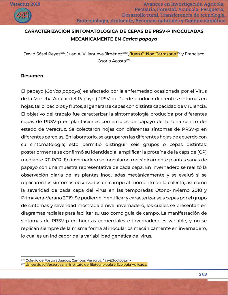 Sósol-Reyes D., Villanueva Jiménez J.A., Noa-Carrazana, J.C. y Osorio- Acosta F. (2019) Caracterización sintomatológica de cepas de PRSV-P inoculadas mecánicamente en Carica papaya. Año 3, Núm. 1, 2113-2121 pp. ISSN: 2594-147X. |