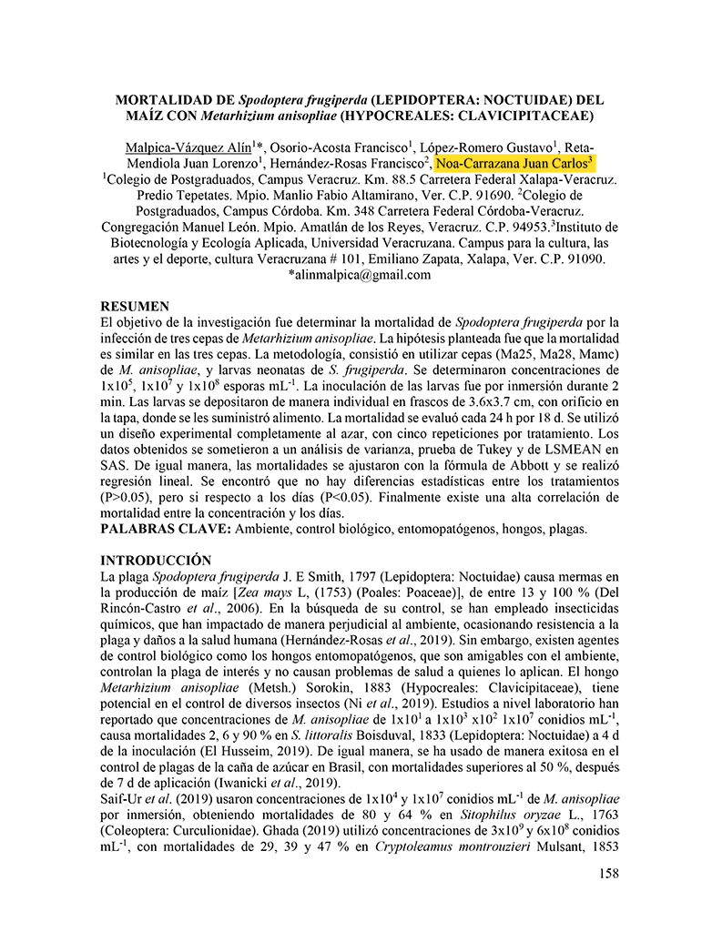 Malpica-Vázquez A., Osorio-Acosta F., López-Romero G., Reta-Mendiola J.L., Hernández-Rosas F. y Noa-Carrazana, J.C. (2019). Mortalidad de Spodoptera frugiperda (Lepidoptera: Noctuidae) del Maíz con Metarhizium anisopliae (Hypocreales: Clavicipitaceae) 158-162 pp. |