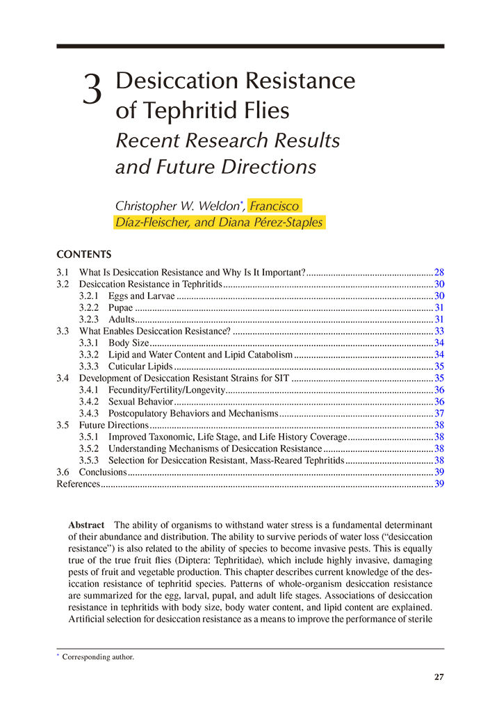 Christopher W. Weldon, Francisco Díaz-Fleischer, Diana Pérez-Staples (2019). Desiccation Resistance of Tephritid Flies 1st Edition, November 2019, 27-43 pp. eBook ISBN: 9780429355738 DOI: 10.1201/9780429355738 |