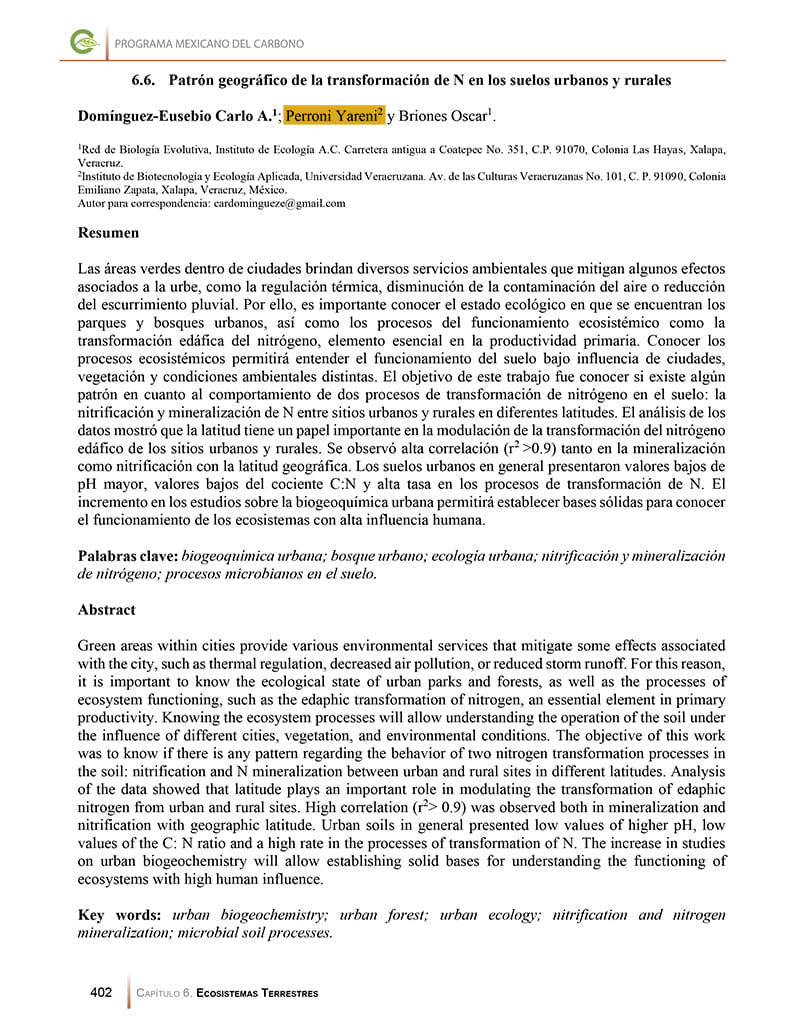 Domínguez-Eusebio C.A., Perroni Y, Briones O. (2020). Patrón geográfico de la transformación de N en suelos urbanos y rurales Diciembre 2020, 402-408 pp. |