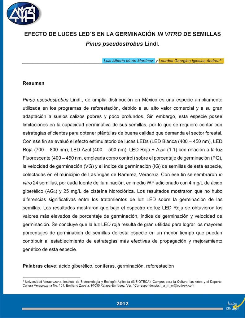 Luis Alberto Marín Martínez y Lourdes Georgina Iglesias Andreu (2022). Efecto de luces LED´S en la germinación in vitro de semillas Pinus pseudostrobus Lindl. Enero 2022, 2012-2022 pp. ISBN: 978-607-37-1396-2 |
