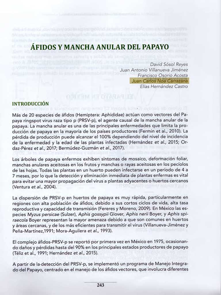 Sósol-Reyes D., Villanueva Jiménez J.A., Osorio- Acosta F., Noa-Carrazana, J.C. y Hernández Castro, E. (2022). Capt 8. Áfidos y Mancha anular del Papayo. Pp:243-273. Publicado:2022-10-21. Ier Edición. 300p. ISBN: 978-607-715-449-5 |