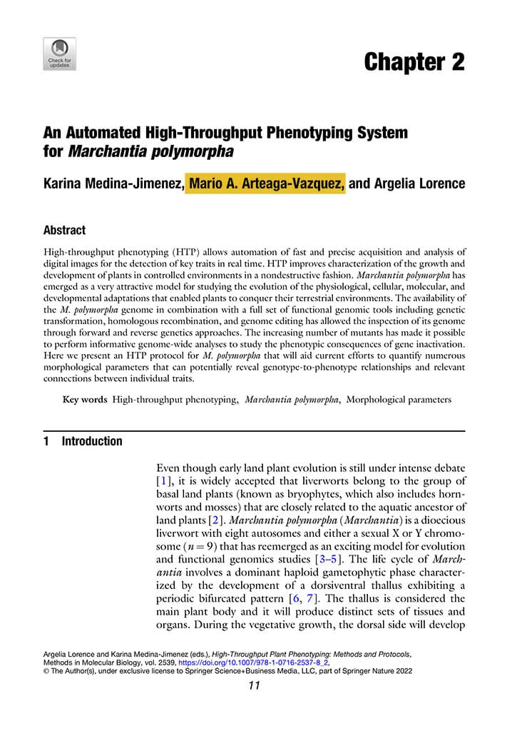 Karina Medina-Jimenez, Mario A. Arteaga-Vazquez, and Argelia Lorence (2022). An Automated High-Throughput Phenotyping System for Marchantia polymorpha July 2022, 11-17 pp. ISBN: 978-1-0716-2536-1, ISBN: 978-1-0716-2537-8 (eBook) DOI: 10.1007/978-1-0716-2537-8 |