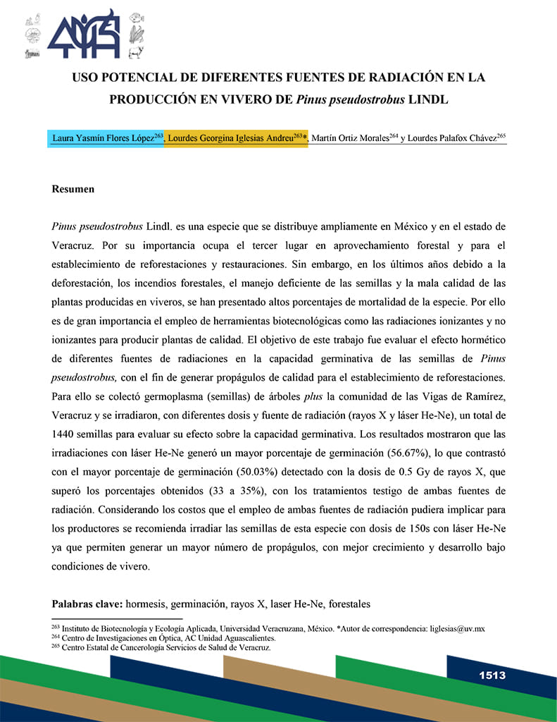 Laura Yasmín Flores López, Lourdes Georgina Iglesias Andreu, Martín Ortiz Morales y Lourdes Palafox Chávez (2023). Uso potencial de diferentes fuentes de radiación en la producción en vivero de Pinus oseudostrobus Lindl. Primera edición: 1513-1523 pp. ISBN: 978-607-37-1573-7 |