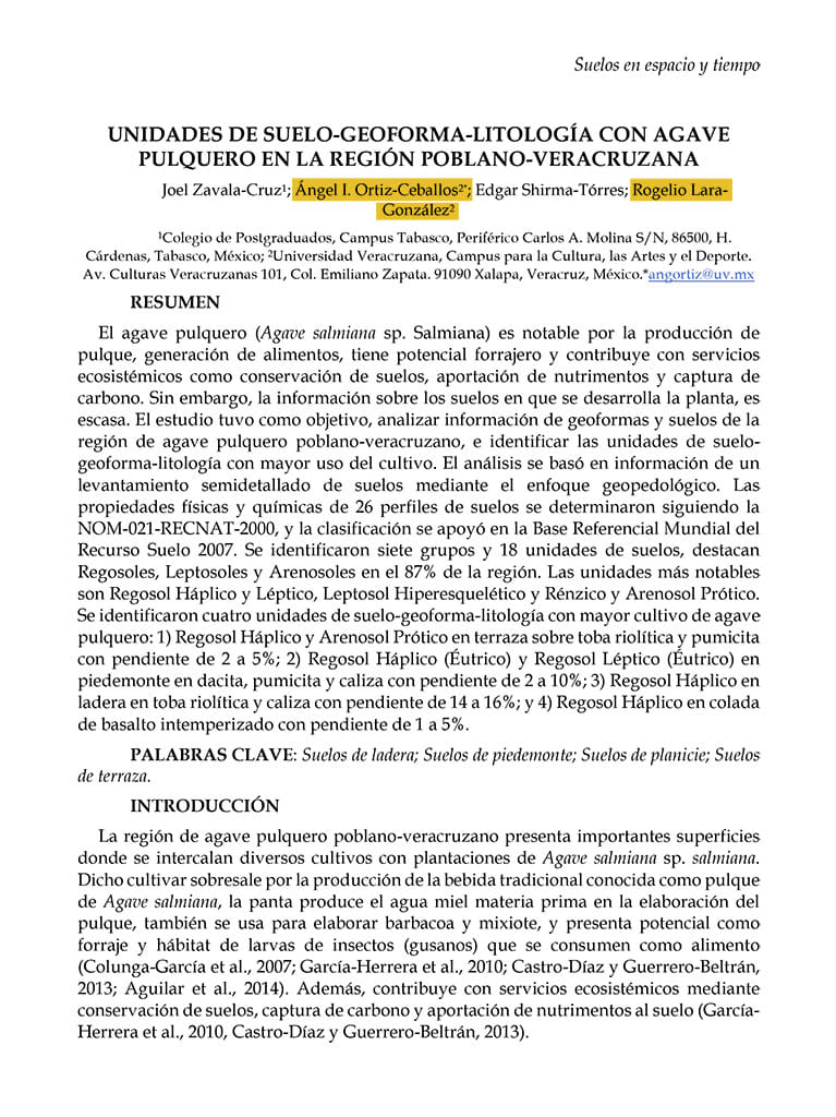Joel Zavala-Cruz; Ángel I. Ortiz-Ceballos; Edgar Shirma-Tórres; Rogelio Lara- González (2023). Unidades de suelo-geoforma-litología con agave pulquero en la región poblano-veracruzana Primera edición: 91 pp. ISBN OBRA COMPLETA: 978-607-95106-5-7, ISBN DEL VOLUMEN 1: 978-607-95106-6-4 |