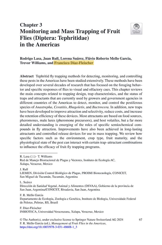 Rodrigo Lasa, Juan Rull, Lorena Suárez, Flávio Roberto Mello Garcia, Trevor Williams & Francisco Díaz-Fleischer (2024). Monitoring and Mass Trapping of Fruit Flies (Diptera: Tephritidae) in the Americas March 2024, first edition: 67-126 pp. DOI: https://doi.org/10.1007/978-3-031-48608-1_3 ISBN: 978-3-031-48607-4 |