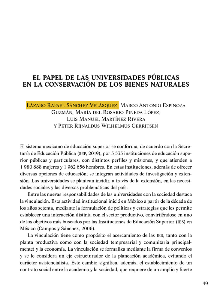 Sánchez Velásquez L.R., Espinoza Guzmán M.A., Pineda López Ma. del R., Martínez Rivera L.M y Gerritsen P.R.W. (2024). El papel de las Universidades Públicas en la Conservación de los Bienes Naturales. Mayo 2024, Primera edición: 49-72 pp. DOI: 10.25009/uv.2997.1807 ISBN: 978-607-8969-47-0 |