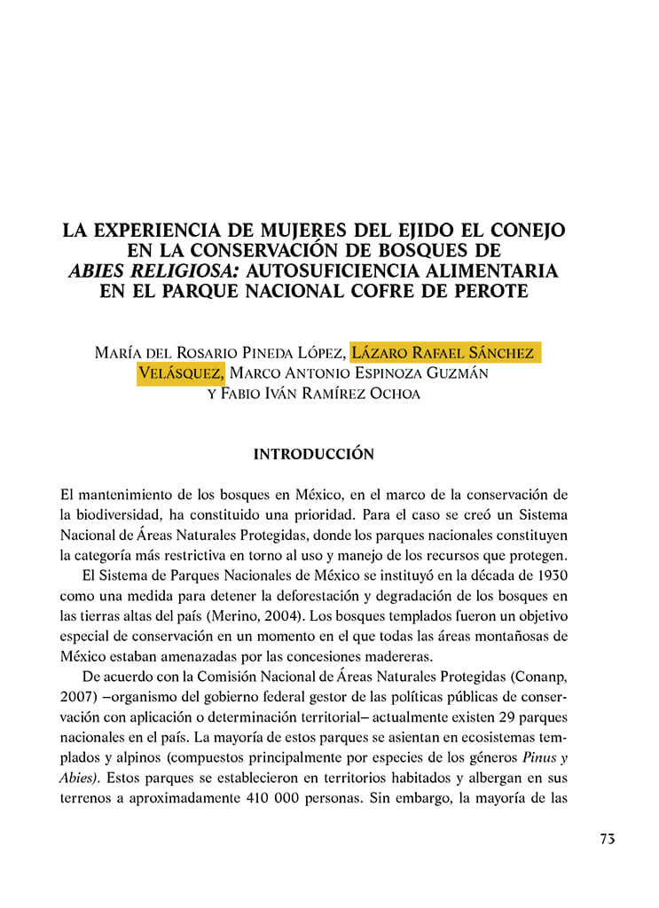 Pineda López Ma. del R., Sánchez Velásquez L.R., Espinoza Guzmán M.A. y Ramírez Ocho F.I. (2024). La Experiencia de Mujeres del Ejido El Conejo en la Conservación de Bosques de Abies religiosas: Autosuficiencias Alimentaria en el Parque Nacional Cofre de Perote. Mayo 2024, Primera edición: 73-91 pp. DOI: 10.25009/uv.2997.1807 ISBN: 978-607-8969-47-0 |