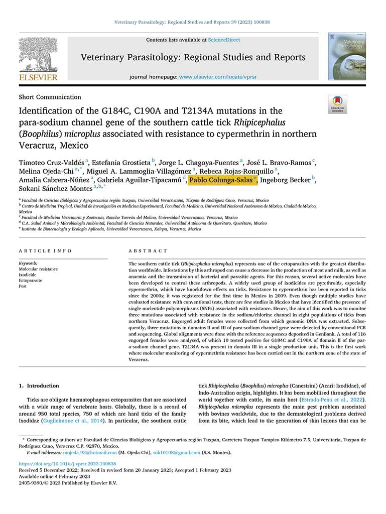 Identification of the G184C, C190A and T2134A mutations in the para-sodium channel gene of the southern cattle tick Rhipicephalus (Boophilus) microplus associated with resistance to cypermethrin in northern Veracruz, Mexico