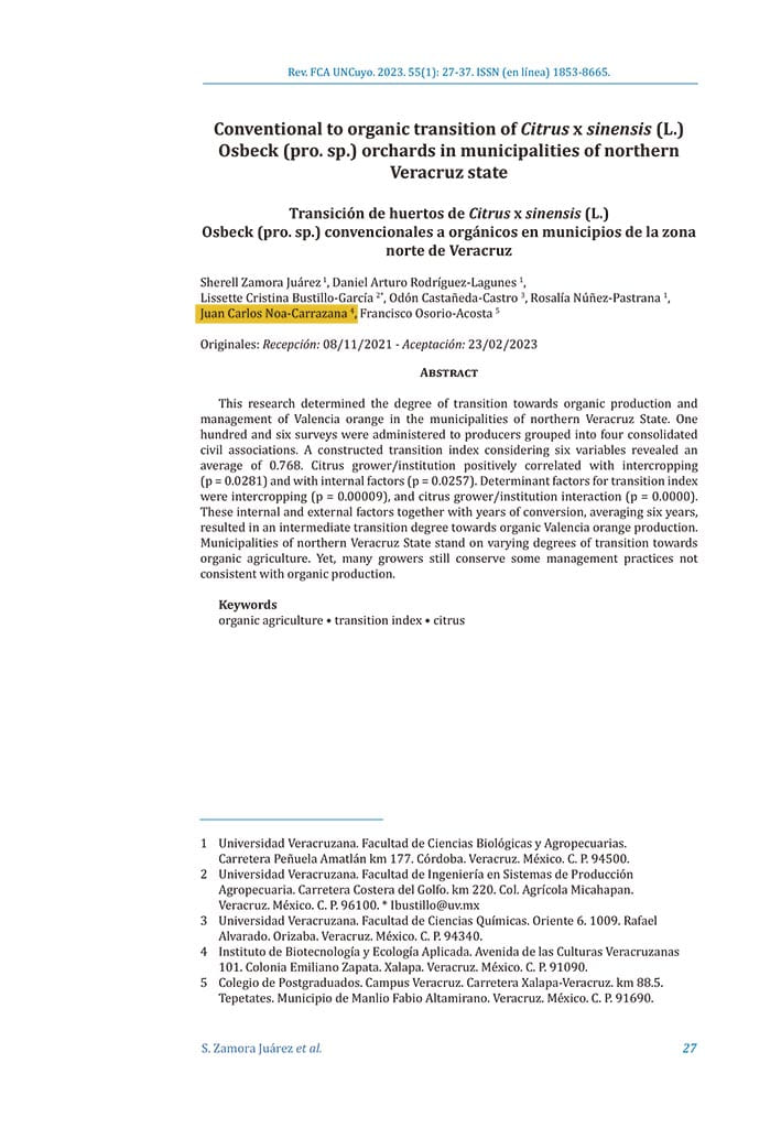 Conventional to organic transition of Citrus x sinensis (L.) Osbeck (pro. sp.) orchards in municipalities of northern Veracruz state