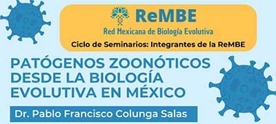 Participante: Colunga-Salas Pablo Francisco Dr. Autores: Pablo Colunga-Salas Título: Patógenos zoonóticos desde la biología evolutiva en México Tipo de participación: Ponencia en línea Nombre del evento: Ciclo de Seminarios de la ReMBE Organizador: Red Mexicana de Biología Evolutiva Lugar y fecha: Ciudad de México, México – 07/12/2022 Tipo de evento: Nacional |