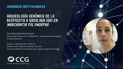 Participante: Dorantes-Acosta, Ana Elena Dra. Autores: Lizbeth Landa Hernández, Ana Elena Dorantes Acosta Título: Arqueología genómica de la respuesta a Gadolinio (GC) en Marchantia polymorpha Tipo de participación: Ponencia Nombre del evento: Seminarios Institucionales 2024 Organizador: Centro de Ciencias Genómicas (CCG) Lugar y fecha: Ciudad de México, México, 11/04/2024 Tipo de evento: Nacional |