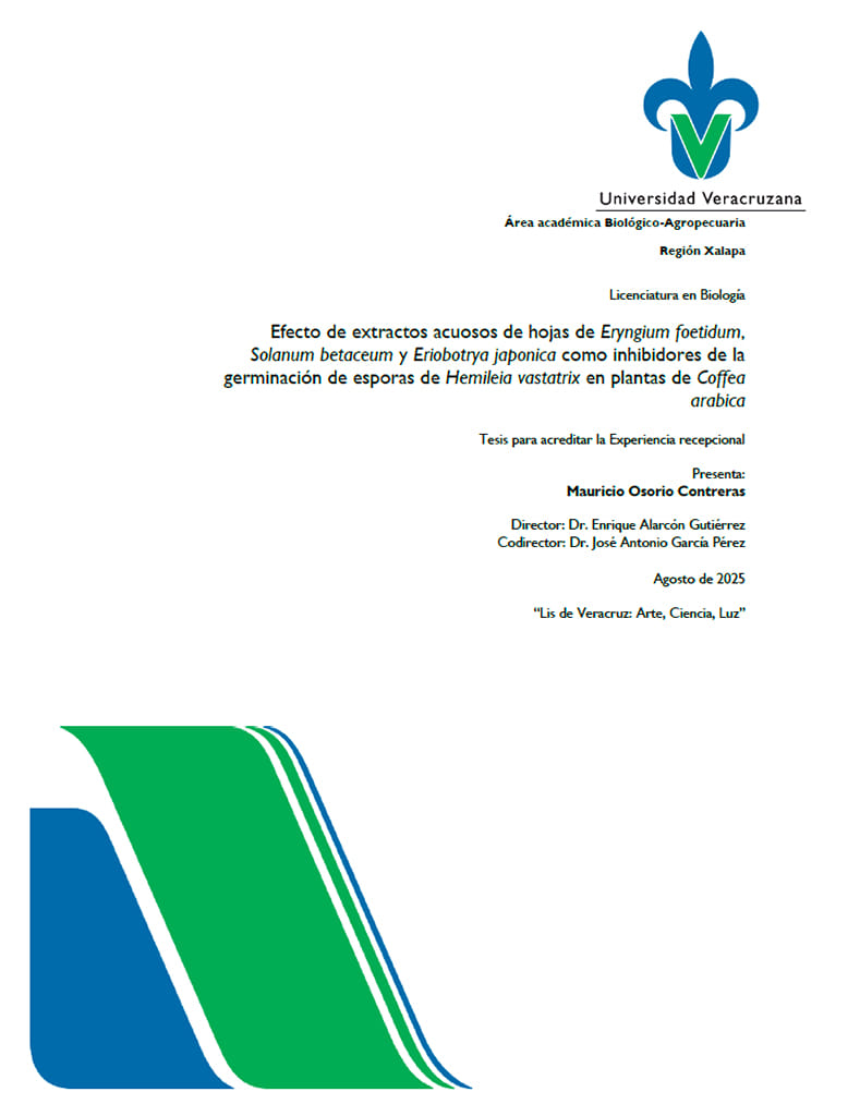 Tesis: Efecto de extractos acuosos de hojas de Eryngium foetidum , Solanum betaceum y Eriobotrya japonica como inhibidores de la germinación de esporas de Hemileia vastatrix en plantas de Coffea arabica