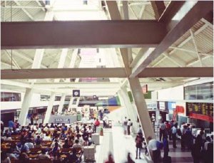 salidas y llegadas, espera, venta de boletos, comercio y recreación, al que se accede desde una rampa construida en mampostería y puentes de concreto reforzado. Los interiores resultan bastante espectaculares por