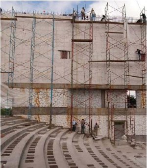 por demás singular en el diseño de un muro escultórico que recuerda algunos de los mejores ejemplos
