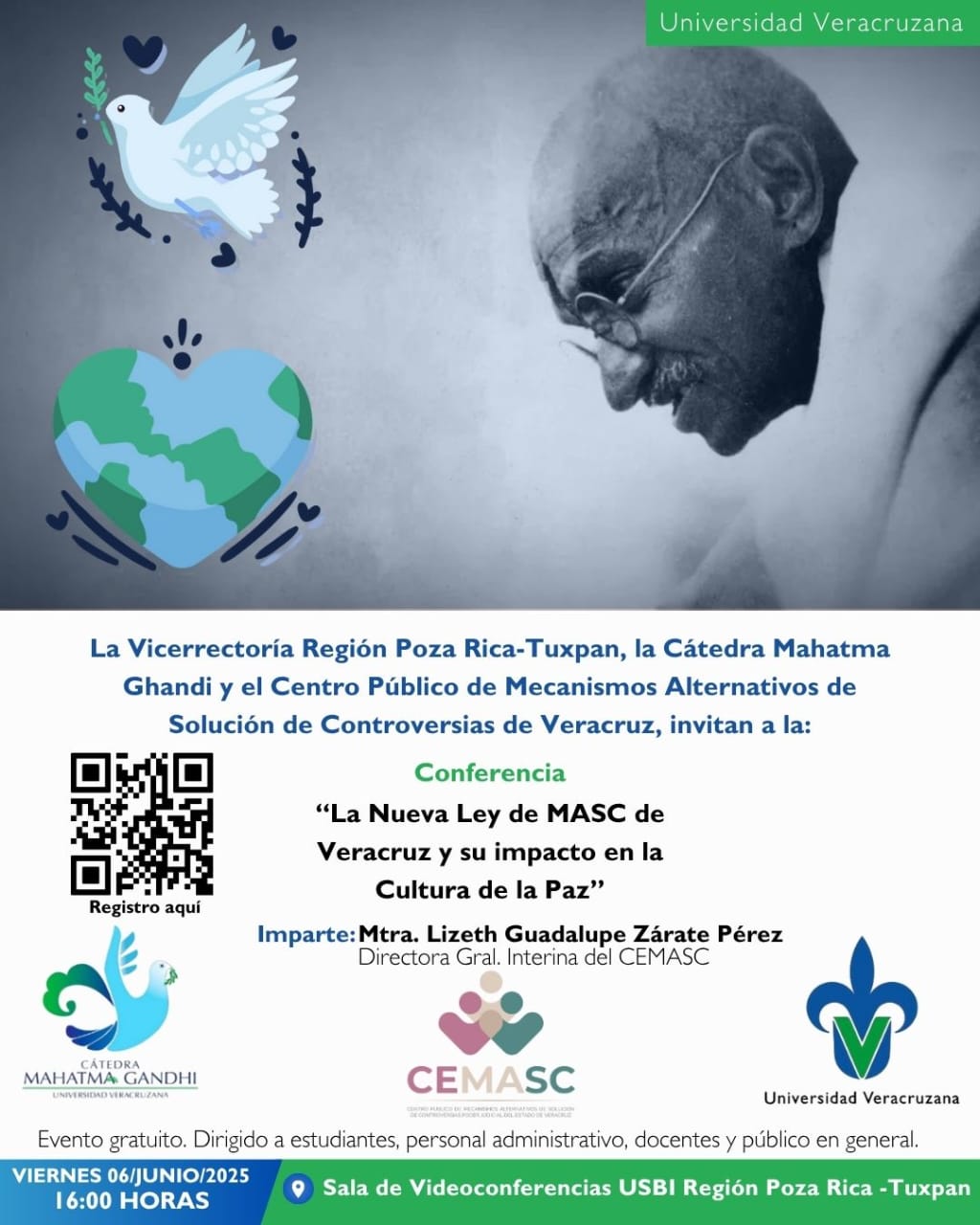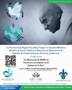 La Vicerrectoría Región Poza Rica-Tuxpan, la Cátedra Mahatma Gandhi y el Centro Público de Mecanismos Alternativos de Solución de Controversias de Veracruz, invitan a la Conferencia: