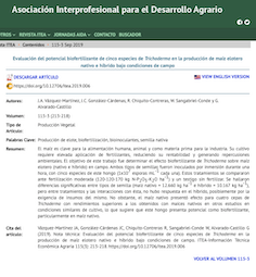 Año: 2019 Título:Evaluación del potencial biofertilizante de cinco especies de Trichoderma en la producción de maíz elotero nativo e híbrido bajo condiciones de campo Enlace: https://doi.org/10.12706/itea.2019.006 Docente: Chiquito Contreras, Wendy Sangabriel Conde, Gerardo Alvarado Castillo Estudiante: Jorge Antonio Vázquez Martínez |
