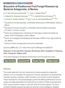 Año: 2019 Título: Biological control of postharvest fungal diseases of fruits by bacterial antagonists: a review Enlace: https://doi.org/10.3390/agronomy9030121 Docente: Roberto G. Chiquito Contreras Estudiante: Saúl Carmona Hernández |