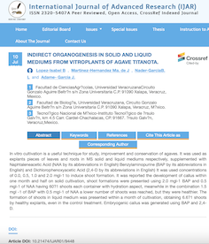 Año: 2019 Título: Indirect Organogenesis in solid and Liquid Mediums From Vitroplants of agave Titanota Enlace: Docente: María de Jesús Martínez Hernández Estudiante: Beatriz Lopez Isabel |