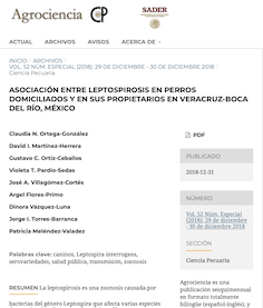 Año: 2018 Título: Asociación entre Leptospirosis en perros domiciliados y en sus propietarios en Veracruz Boca del Río, México. Agrociencia (52) volumen especial: 67-79. Enlace: https://agrociencia-colpos.mx/index.php/agrociencia/article/view/1739 Docente: Gustavo C. Ortiz-Ceballos, David I. Martínez-Herrera, Argel Flores-Primo Estudiante: Claudia N. Ortega-González |