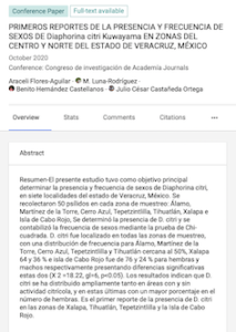 Año: 2020 Primeros reportes de la presencia y frecuencia de sexos de Diaphorina citri Kuwayama en zonas del centro y norte del estado de Veracruz, México. In: Memorias del Congreso Internacional de Investigación Academia Journals Hidalgo 2020. Vol. 12, No. 7, 2020 ISSN online 1946-5351 Enlace: https://www.researchgate.net/publication/344947383 Docente: Mauricio Luna-Rodríguez Estudiante: Araceli Flores-Aguilar |