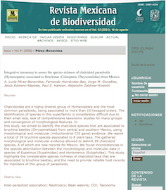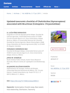 Año: 2020 Título: Integrative taxonomy to assess the species of chalcidoid parasitoids (Hymenoptera) associated to Bruchinae (Coleoptera: Chrysomelidae) from Mexico. Enlace: http://www.revista.ib.unam.mx/index.php/bio/article/view/3492 Docente: Fernando Hernández Baz Estudiante: Alba Lucia Pérez Benavidez |