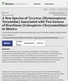 Año: 2020 Título: A new species of Torymus Dalman, 1820 (Hymenoptera, Torymidae) associated with Bruchinae in México. Enlace: https://doi.org/10.1653/024.102.0407 Docente: Fernando Hernández Baz Estudiante: Alba Lucia Pérez Benavidez |