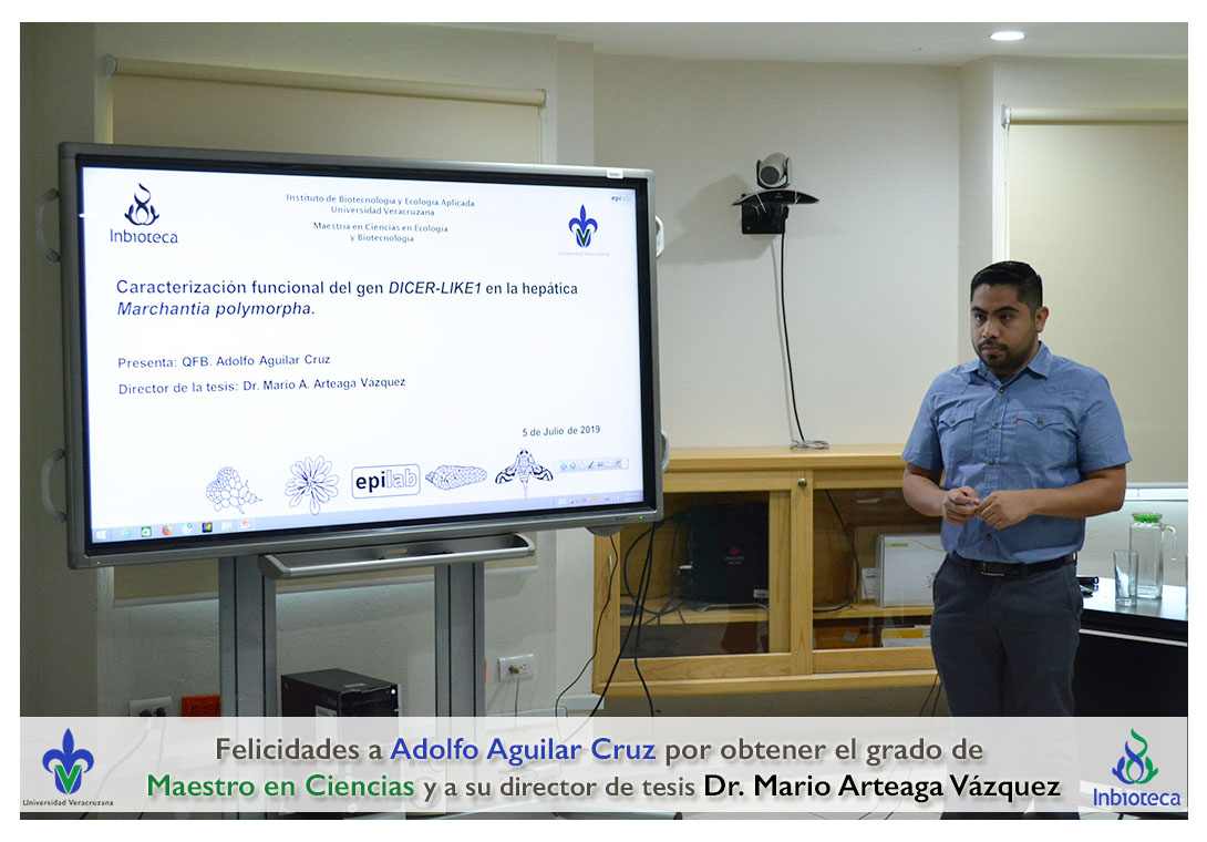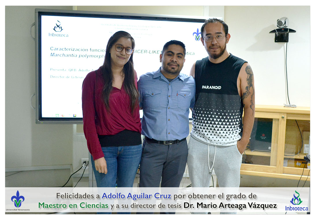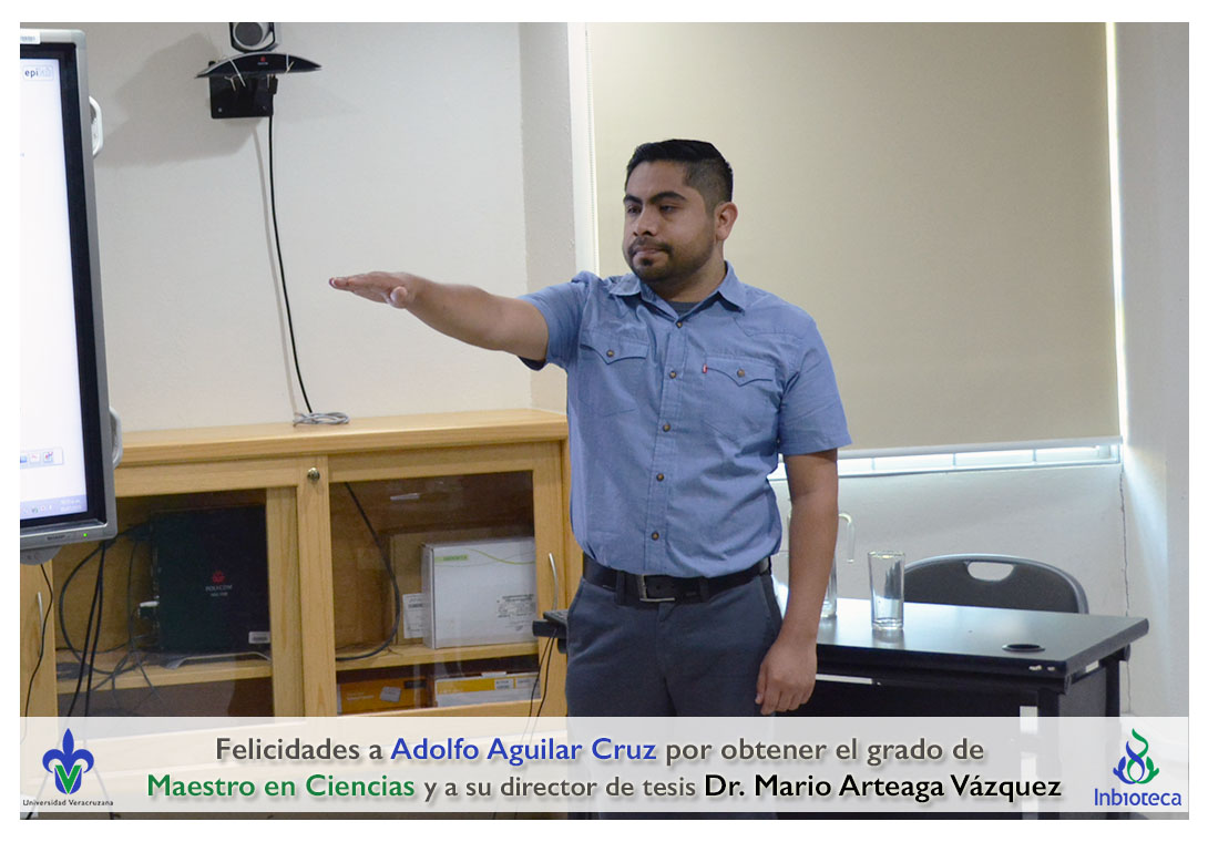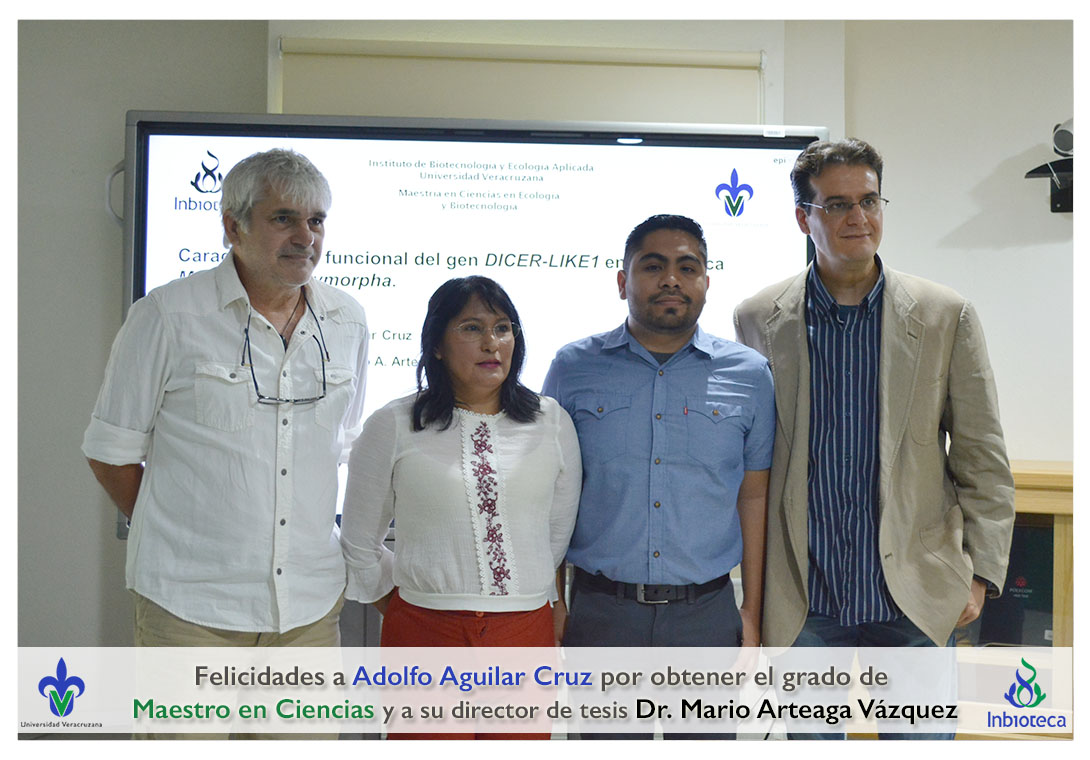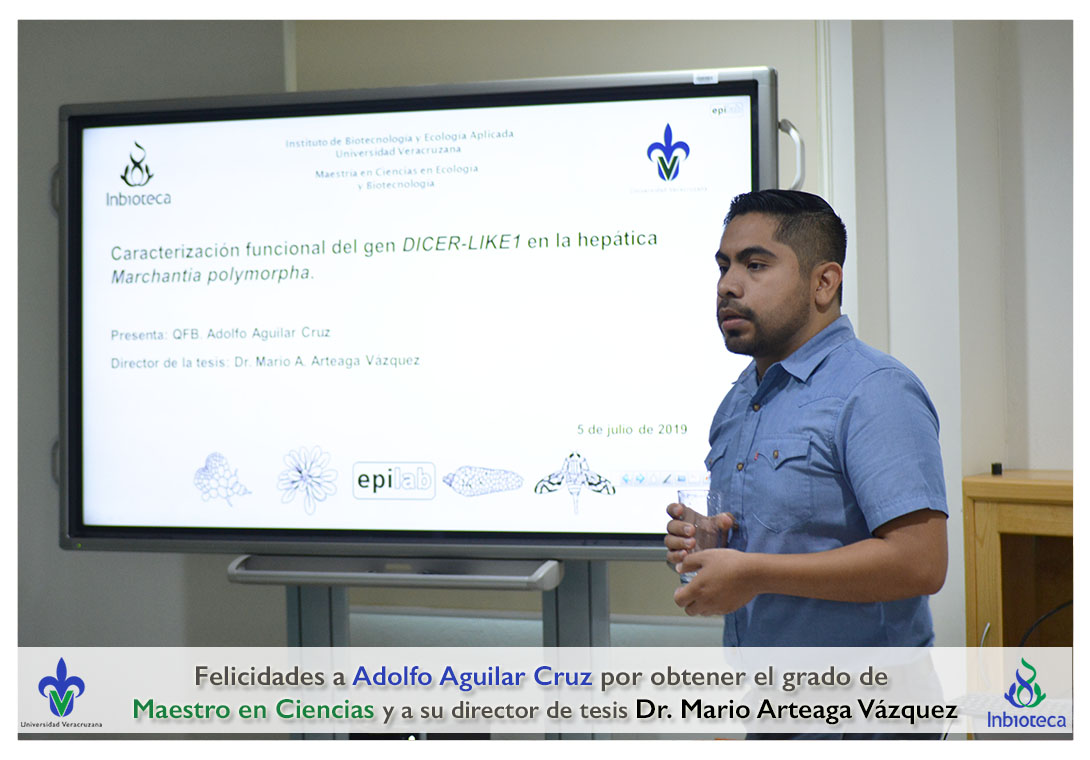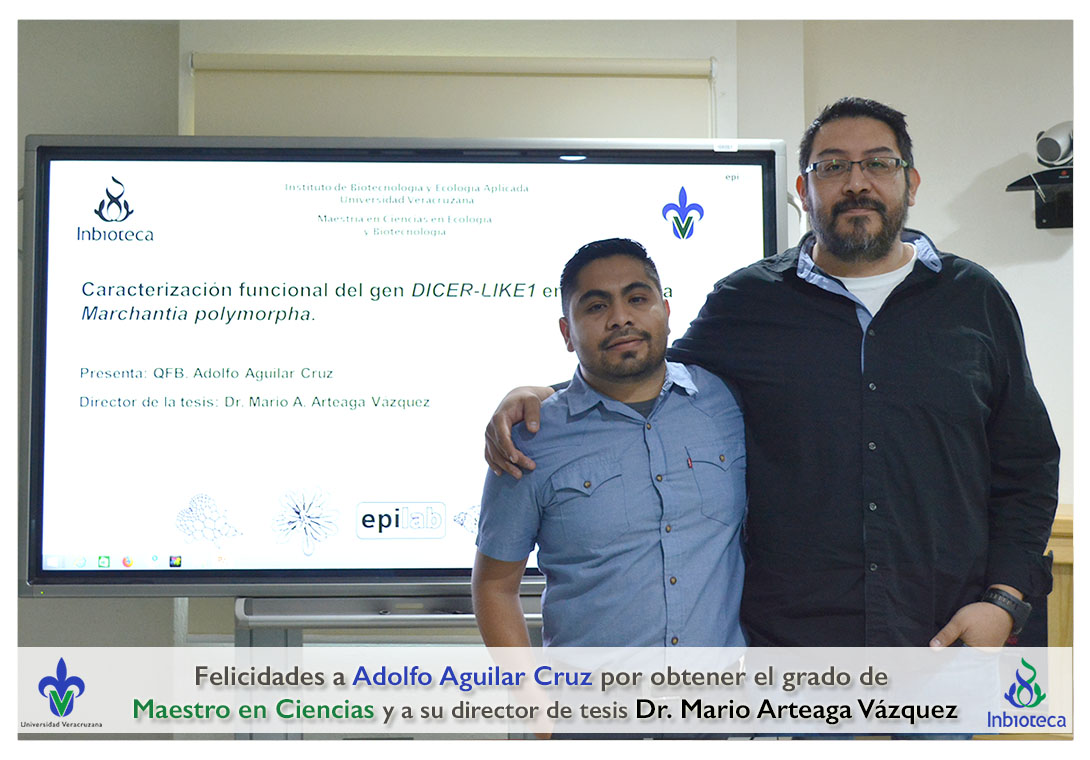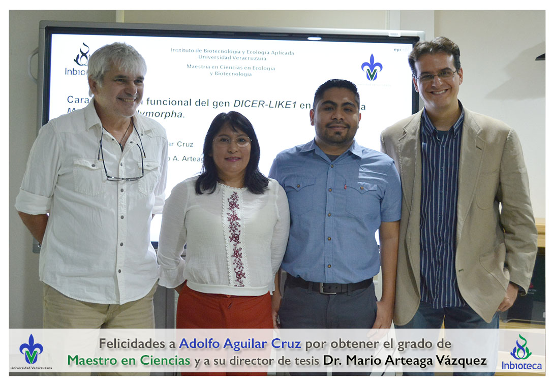 Felicidades Adolfo Aguilar Cruz por obtener el grado de Maestro en Ciencias en Ecología y Biotecnología, a su director de tesis Dr. Mario Alberto Arteaga Vázquez, a su comité y a todos los que contribuyeron en el trabajo realizado. ¡Enhorabuena!