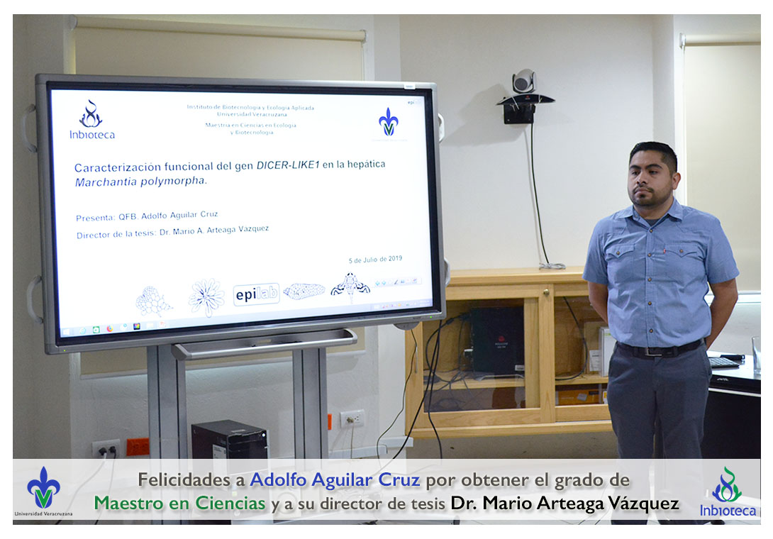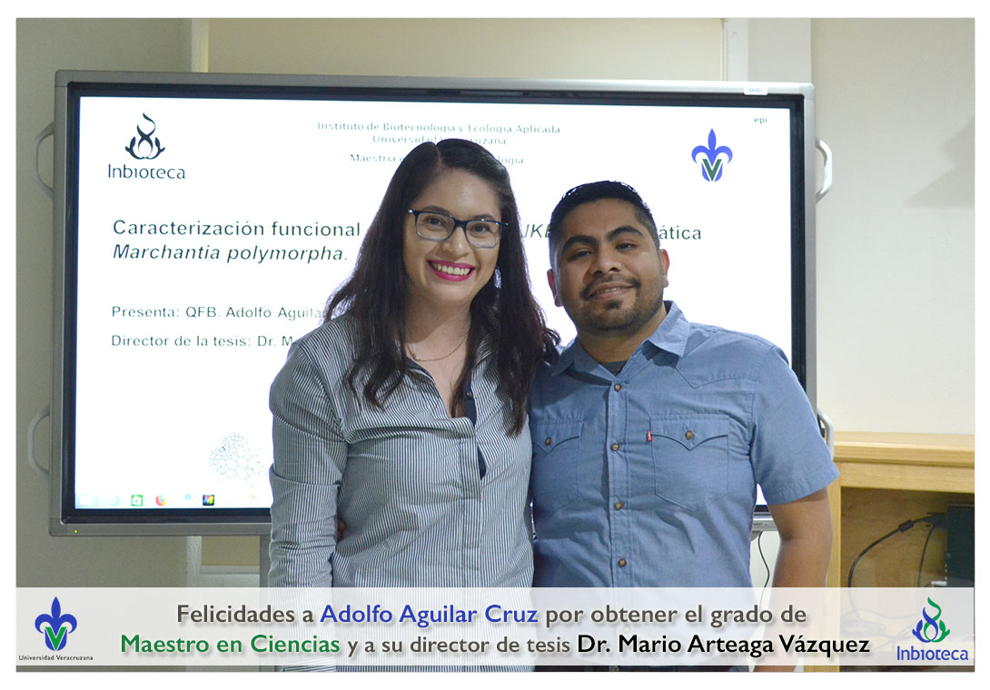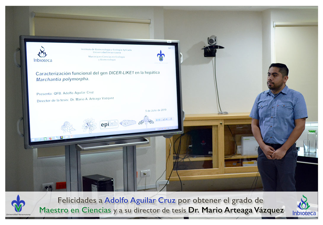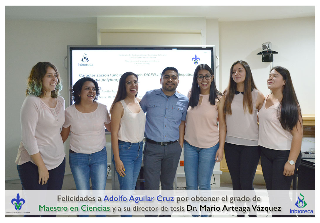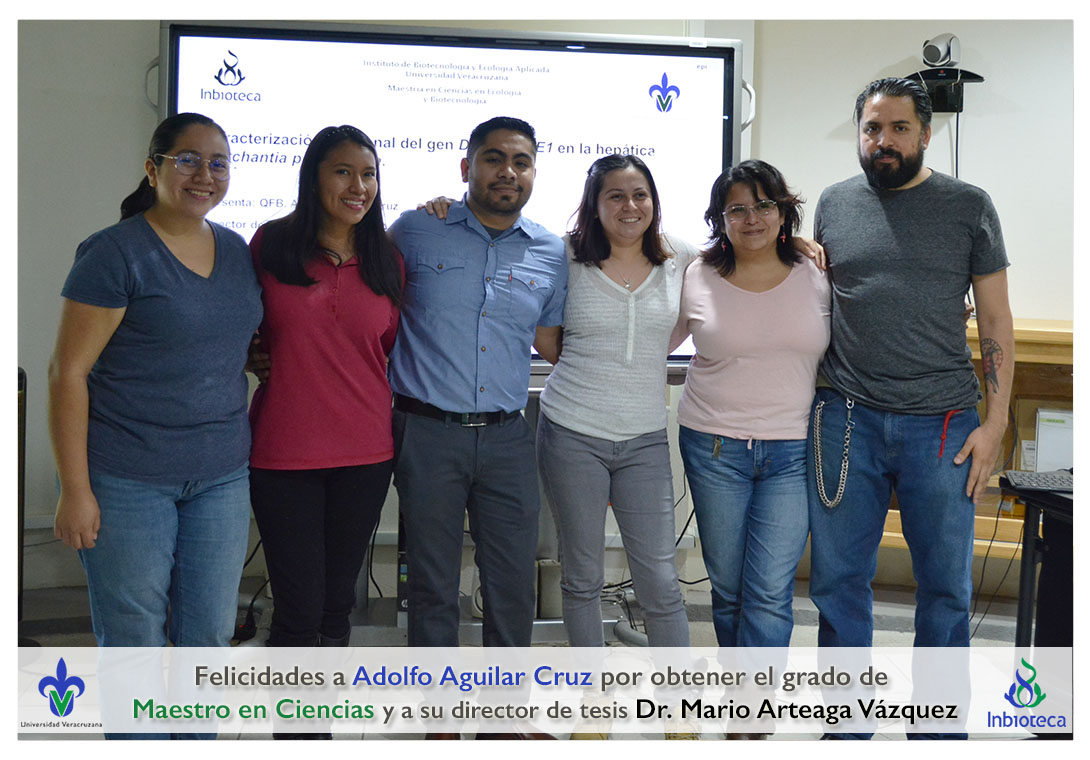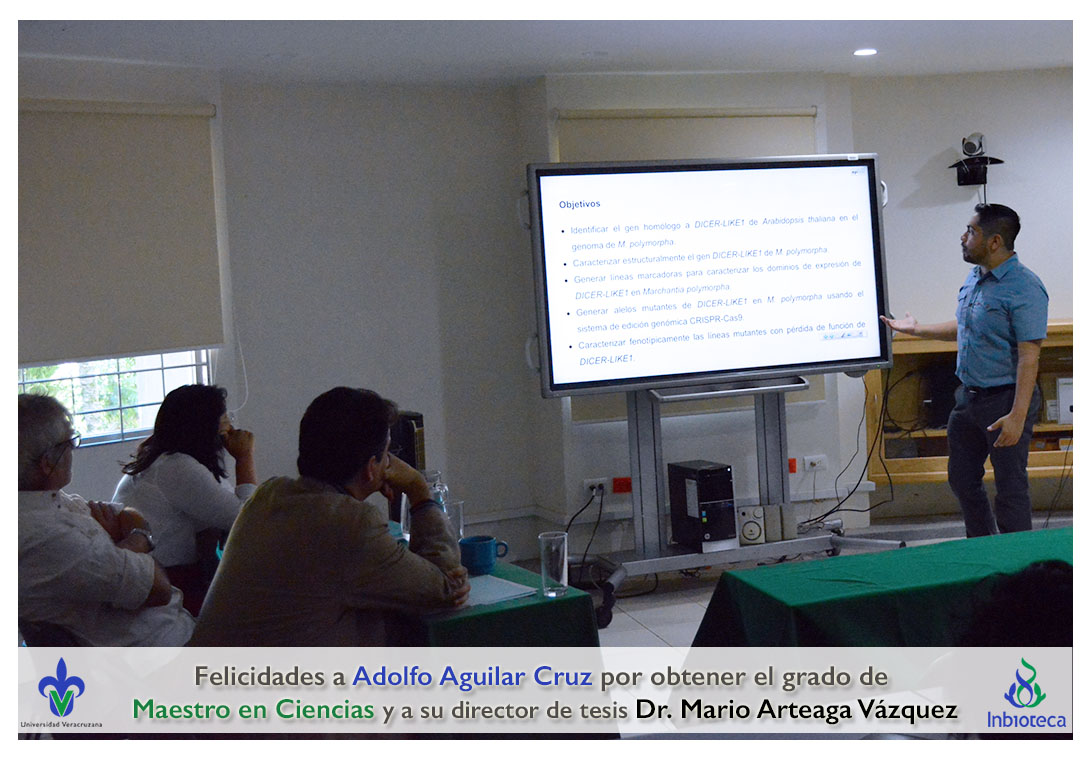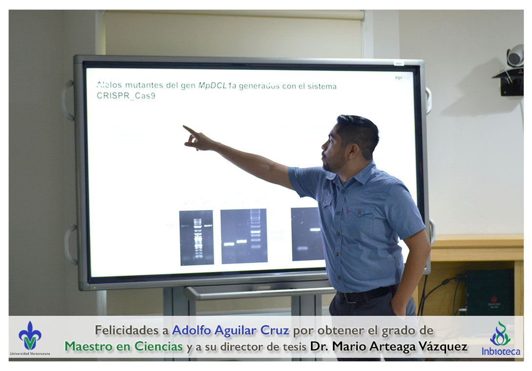 Felicidades Adolfo Aguilar Cruz por obtener el grado de Maestro en Ciencias en Ecología y Biotecnología, a su director de tesis Dr. Mario Alberto Arteaga Vázquez, a su comité y a todos los que contribuyeron en el trabajo realizado. ¡Enhorabuena!
