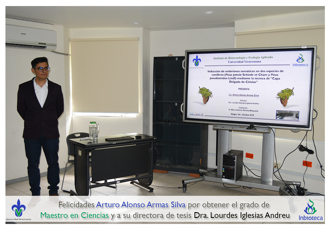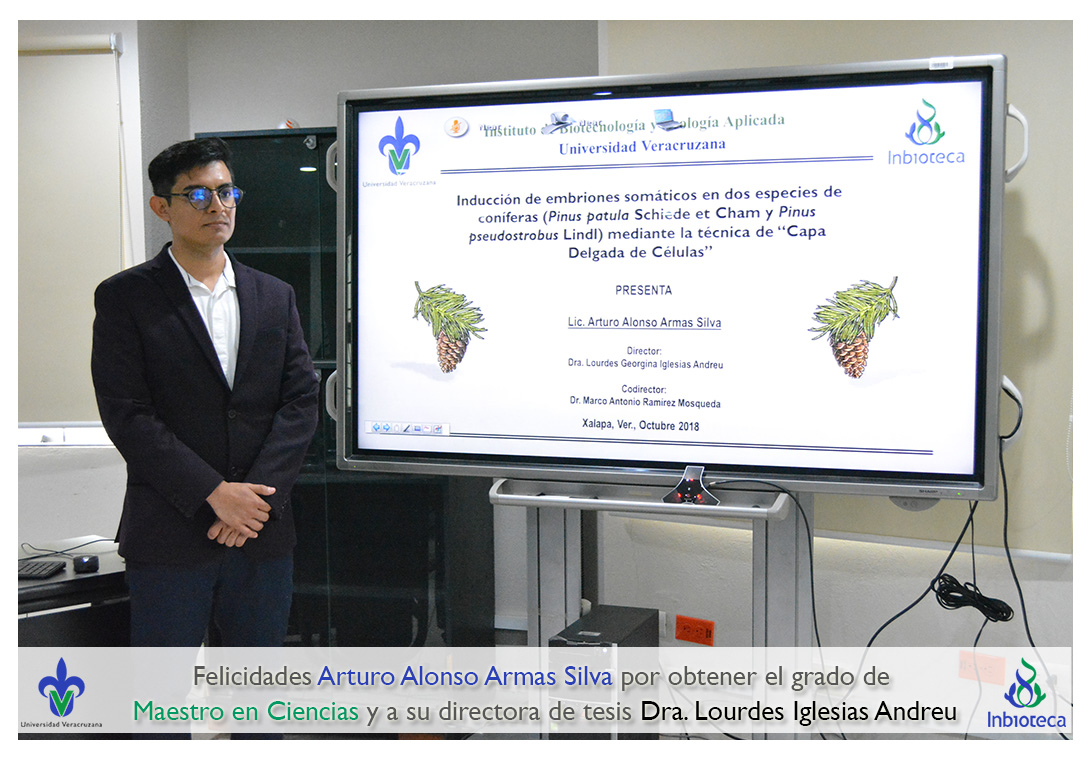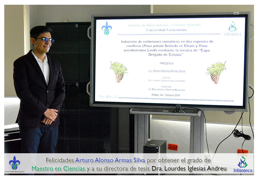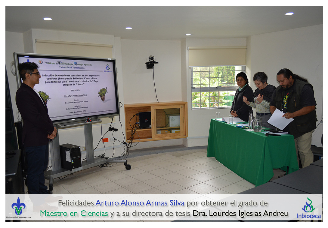 31 de octubre de 2018.- En el Aula de Usos Múltiples del INBIOTECA a las 13:00 horas, se realizó el examen de grado de Maestría con la defensa pública de la tesis titulada: Inducción de embriones somáticos en dos especies de coníferas (Pinus patula Schiede et Cham y Pinus pseudostrobus Lindl) mediante la técnica de "Capa Delgada de Células".