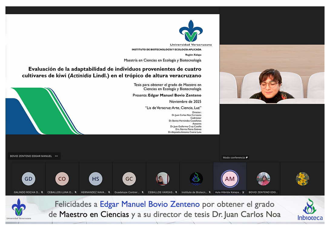 20 de noviembre de 2025.- En el Aula Híbrida del INBIOTECA a las 13:00 horas, se realizó el examen de grado de Maestría con la defensa pública de la tesis intitulada: Evaluación de la adaptabilidad de individuos provenientes de cuatro cultivares de kiwi (Actinidia Lindl.) en el trópico de altura veracruzano. El jurado evaluador lo integró el Dr. Lázaro Rafael Sánchez Velásquez (Presidente), el Dr. Ángel Isauro Ortiz Ceballos (Secretario), y como invitada de la Facultad de Ciencias Agrícolas, la Dra. María de Jesús Martínez Hernández (Vocal Externa).