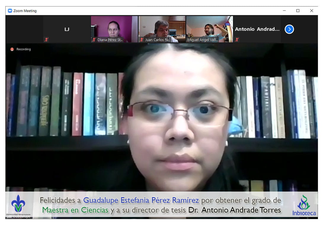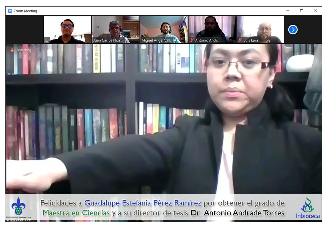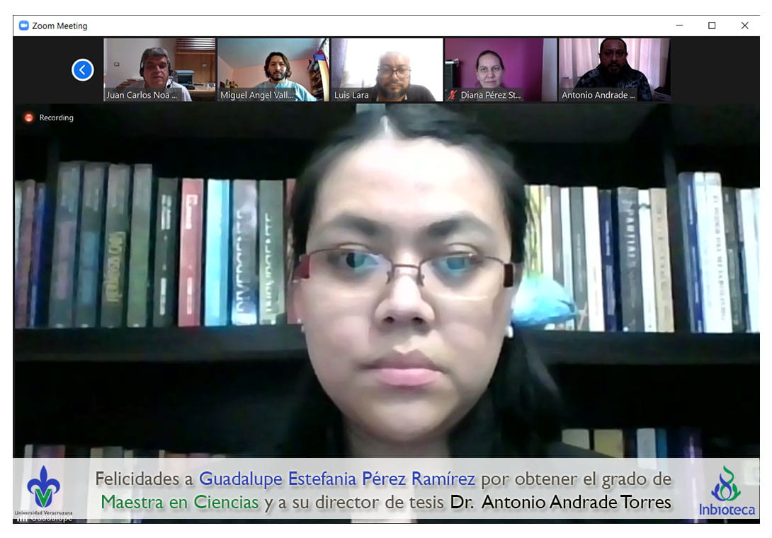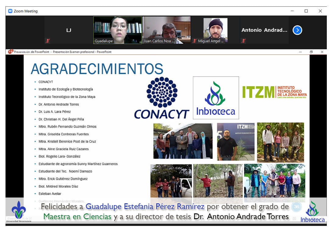 Felicidades a Guadalupe Estefania Pérez Ramírez por obtener el grado de Maestra en Ciencias en Ecología y Biotecnología, a su director de tesis Dr. Antonio Andrade Torres, a su director de tesis Dr. Luis Alberto Lara Pérez, a su comité y a todos los que contribuyeron en el trabajo realizado. ¡Enhorabuena!