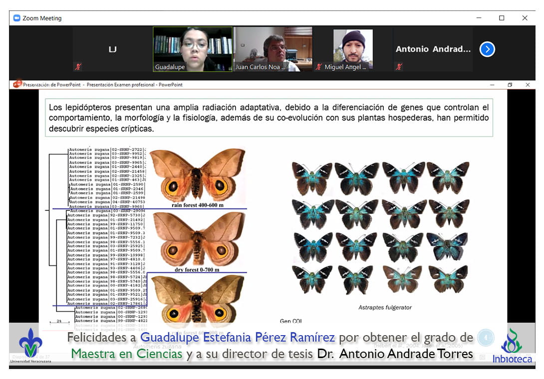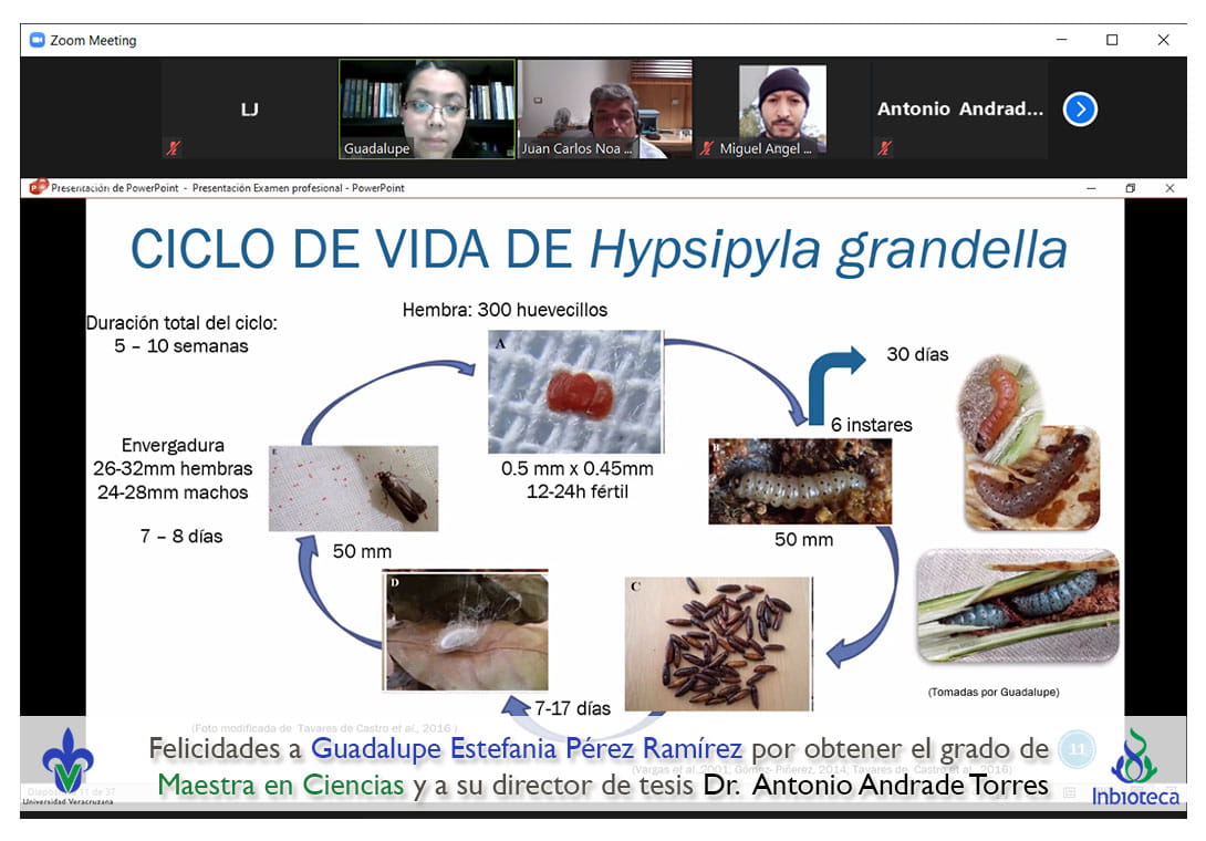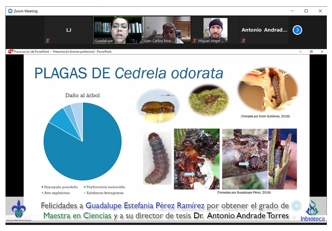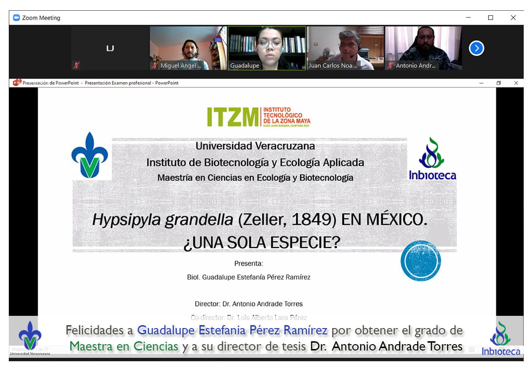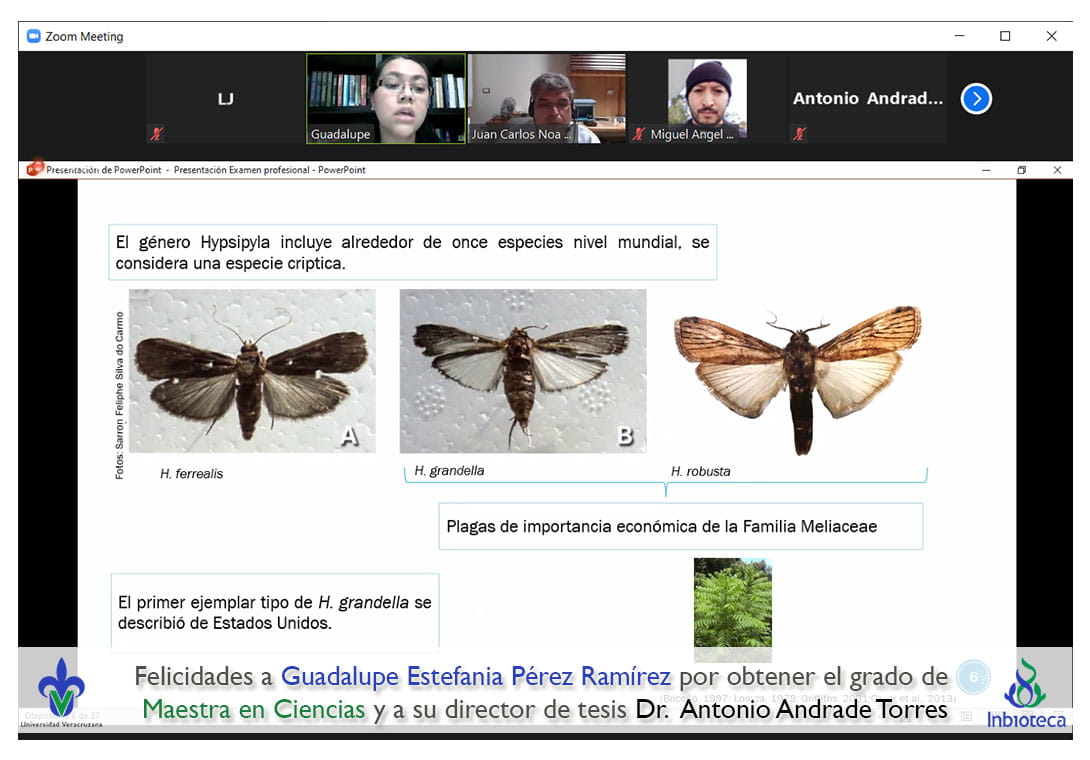 28 de abril de 2021.- A través de videoconferencia, a las 14:00 horas, se realizó el examen de grado de Maestría con la defensa pública de la tesis titulada: Hypsipyla grandella en México. ¿Una sola especie?. El jurado evaluador lo integró el Dra. Diana Folger Pérez Staples (Presidenta), el Dr. Juan Carlos Noa Carrazana (Secretario) y el Dr. Miguel Ángel Vallejo Reyna (Vocal).
