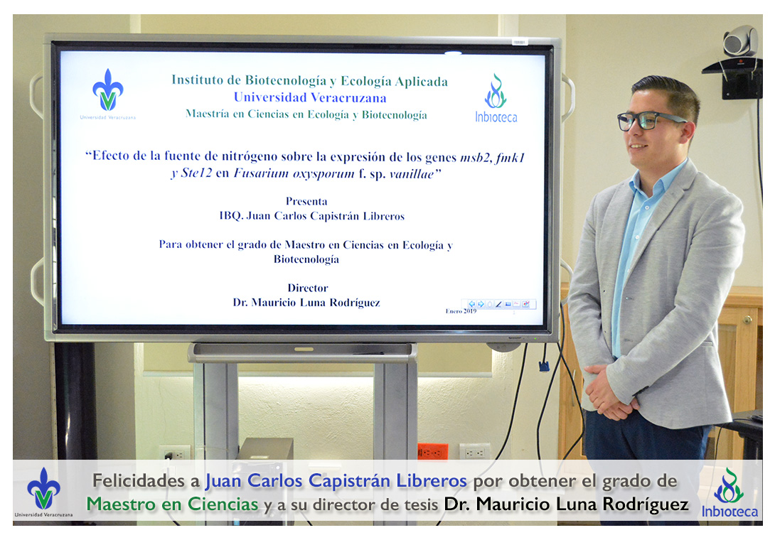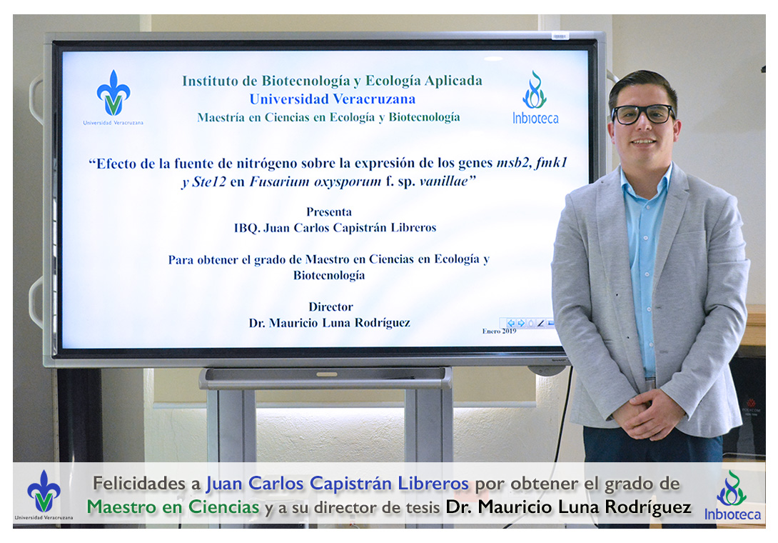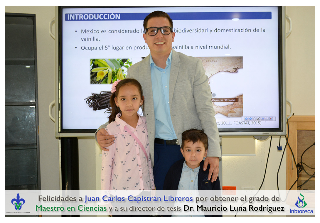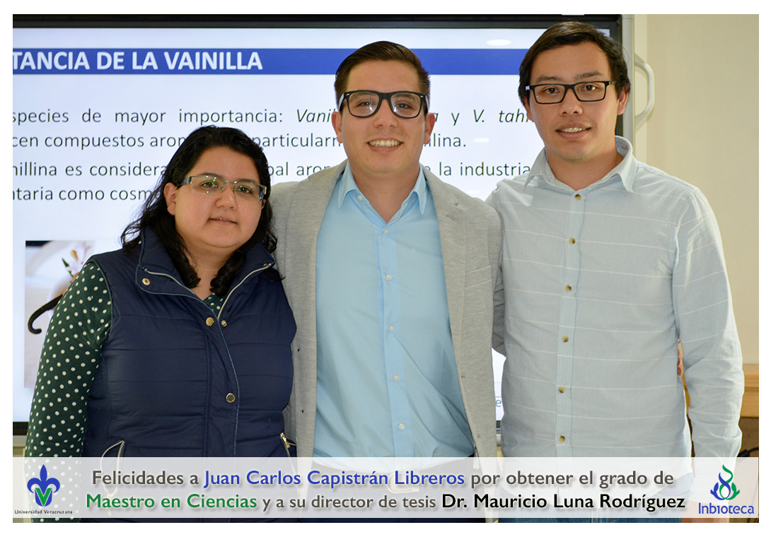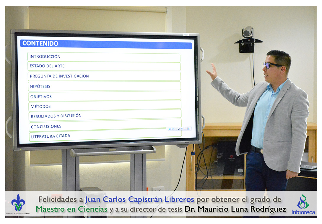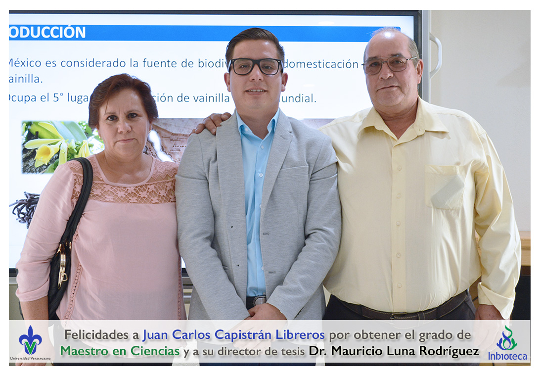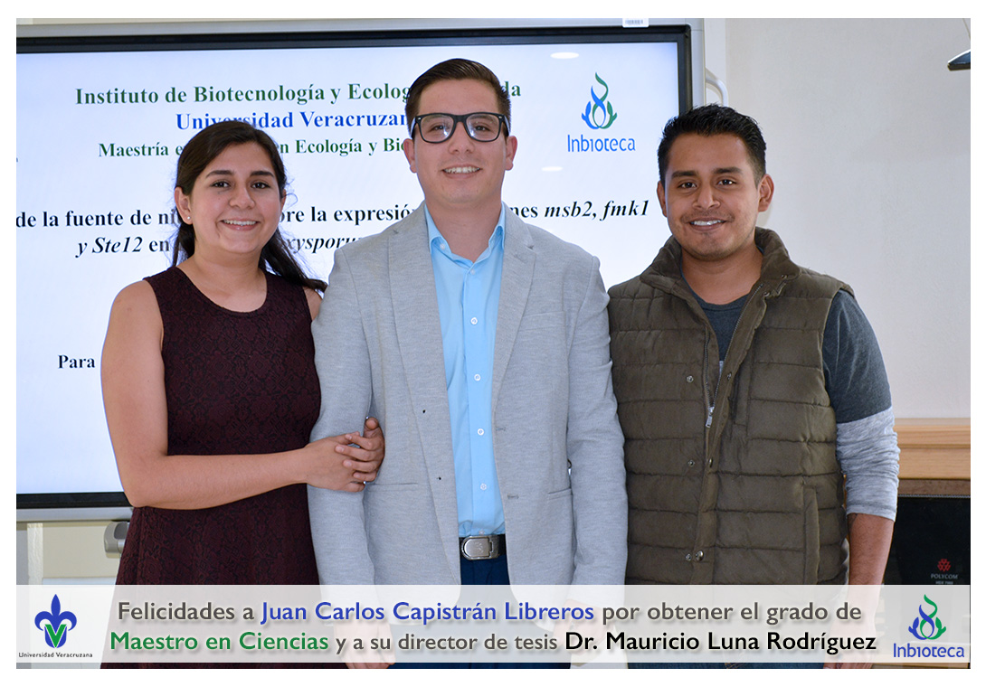 Felicidades a Juan Carlos Capistrán Libreros por obtener el grado de Maestro en Ciencias en Ecología y Biotecnología, a su director de tesis Dr. Mauricio Luna Rodríguez, a su comité y a todos los que contribuyeron en el trabajo realizado. ¡Enhorabuena!