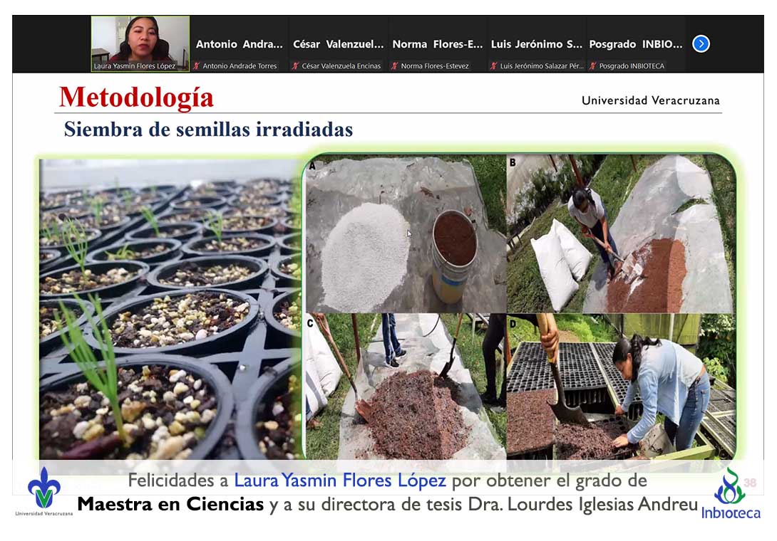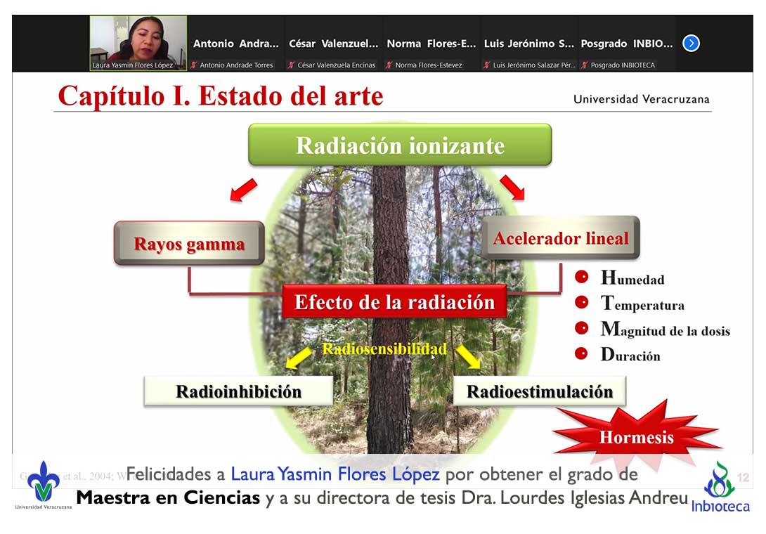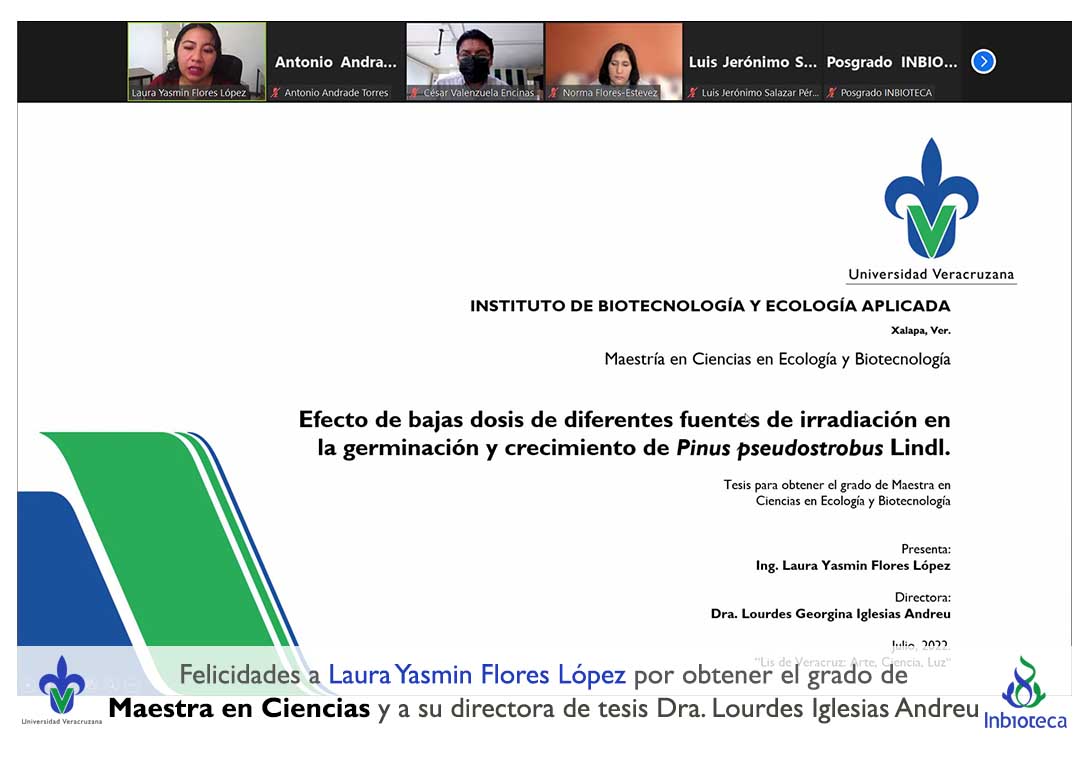 04 de julio de 2022.- A través de videoconferencia a las 13:00 horas, se realizó el examen de grado de Maestría con la defensa pública de la tesis intitulada: Efecto de bajas dosis de diferentes fuentes de irradiación en la germinación y crecimiento de Pinus pseudostrobus Lindl). El jurado evaluador lo integró el Dr. Antonio Andrade Torres (Presidente), la Dra. Norma Flores Estévez (Secretaria), y como invitado externo de la Universidad de la Sierra Juárez, Oaxaca, el Dr. César Valenzuela Encinas (Vocal Externo).
