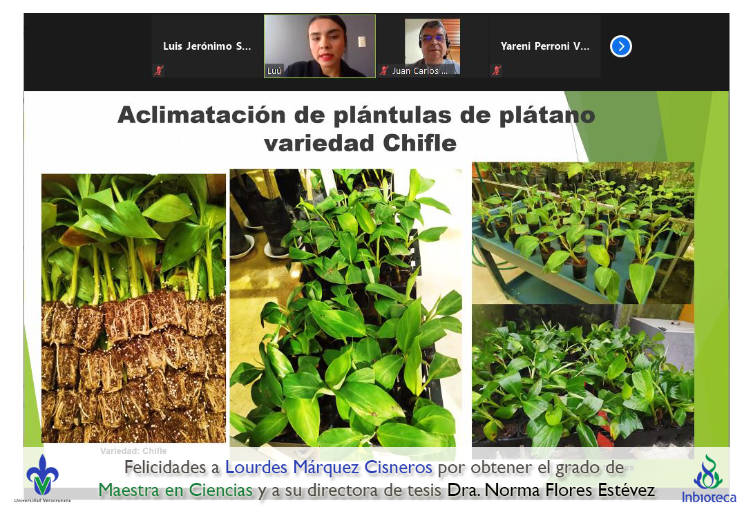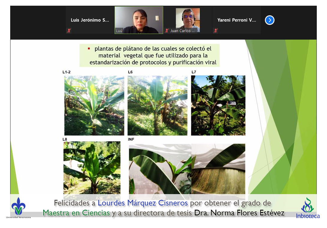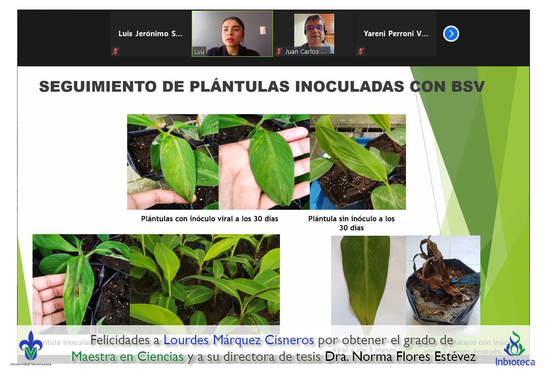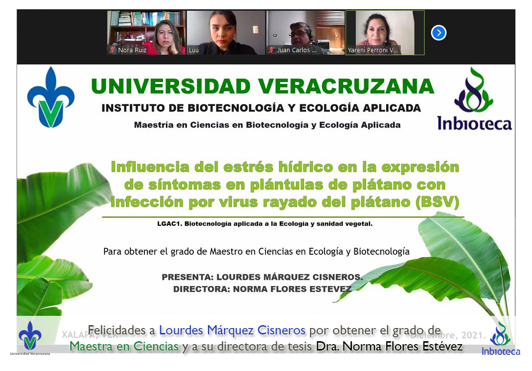 06 de diciembre de 2021.- A través de videoconferencia a las 10:00 horas, se realizó el examen de grado de Maestría con la defensa pública de la tesis intitulada: Influencia del estrés hídrico en la expresión de síntomas en plántulas de plátano con infección por virus rayado del plátano (BSV). El jurado evaluador lo integró la Dra. Yareni Perroni Ventura (Presidenta), el Dr. Juan Carlos Noa Carrazana (Secretario) y como invitada externa del Instituto Tecnológico Superior de Perote (ITSPerote), la Dra. Nora Iseal Ruiz Colorado en calidad de (Vocal).